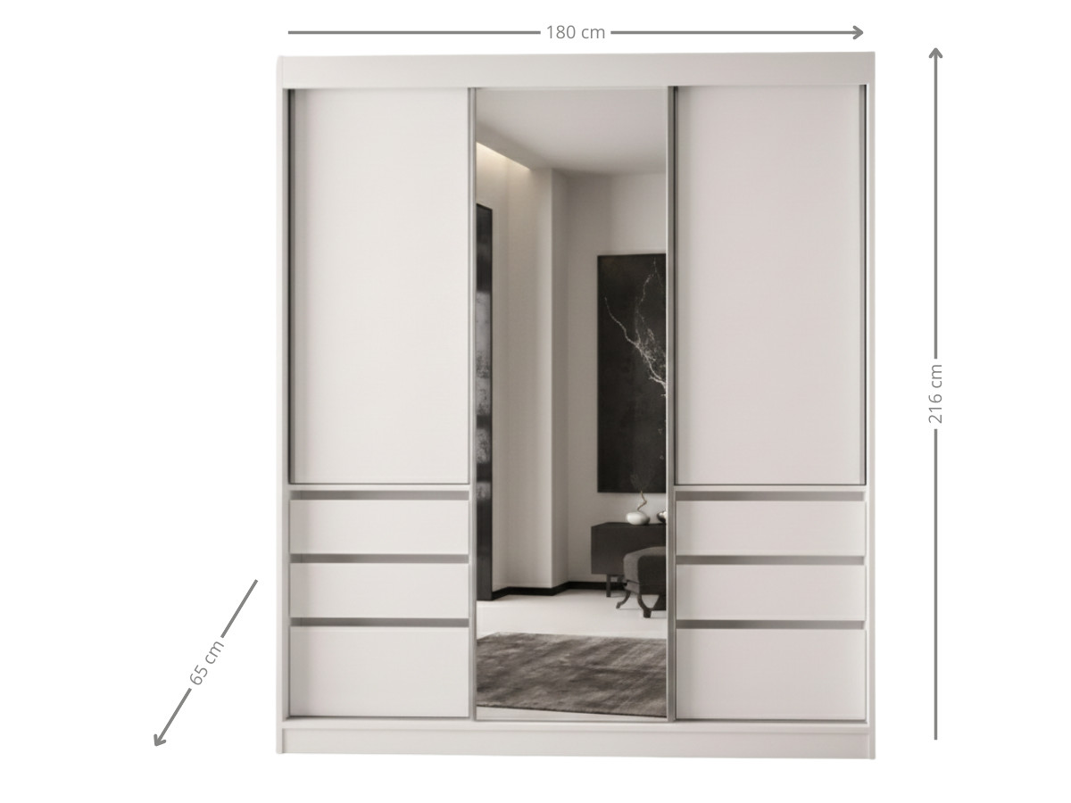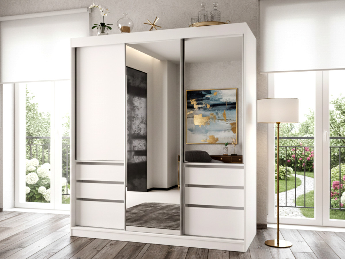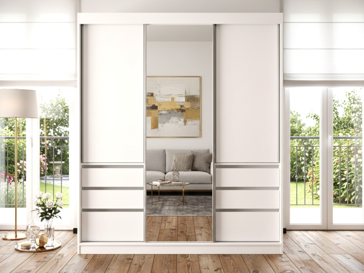 Biała Garderoba Z Szufladami Flin 180 cm – Szafa Przesuwna Z Lustrem 3-Drzwiowa