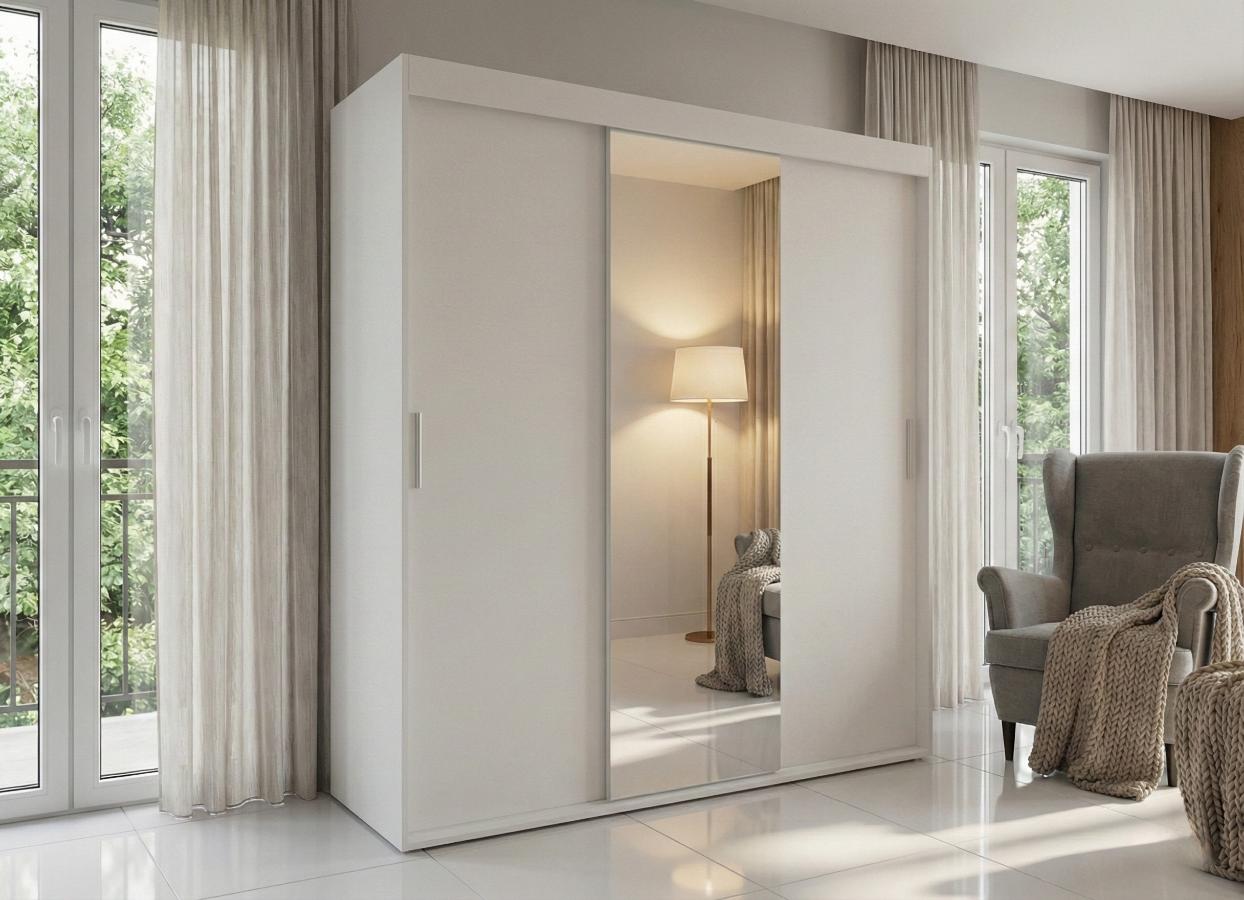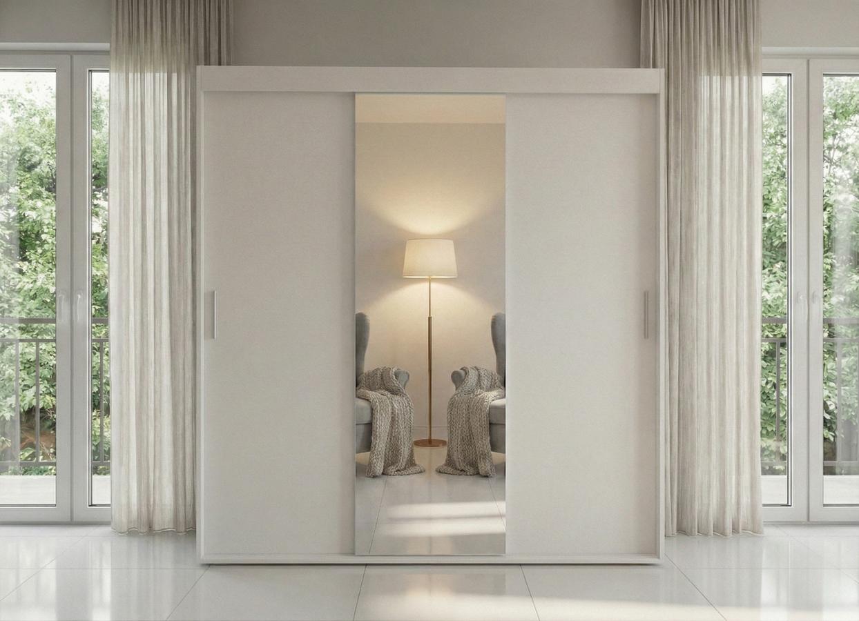 Biała Garderoba Z Szufladami Flin 180 cm - Szafa Przesuwna Z Lustrem 3-Drzwiowa
