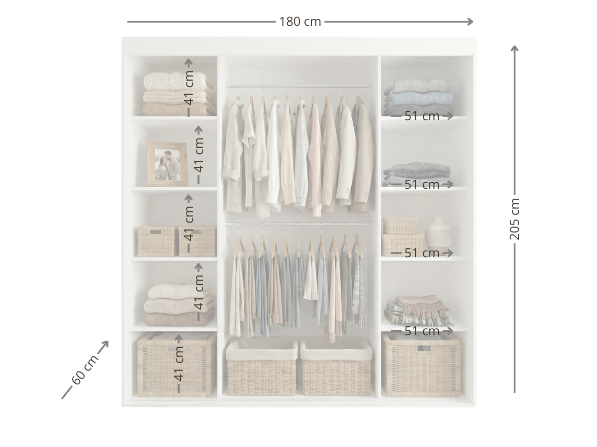 | WYPOSAŻENIE | LEWA STRONA: 5 WNĘK (4 PÓŁKI), PRAWA STRONA: 5 WNĘK (4 PÓŁKI), ŚRODEK: 2 DRĄŻKI |