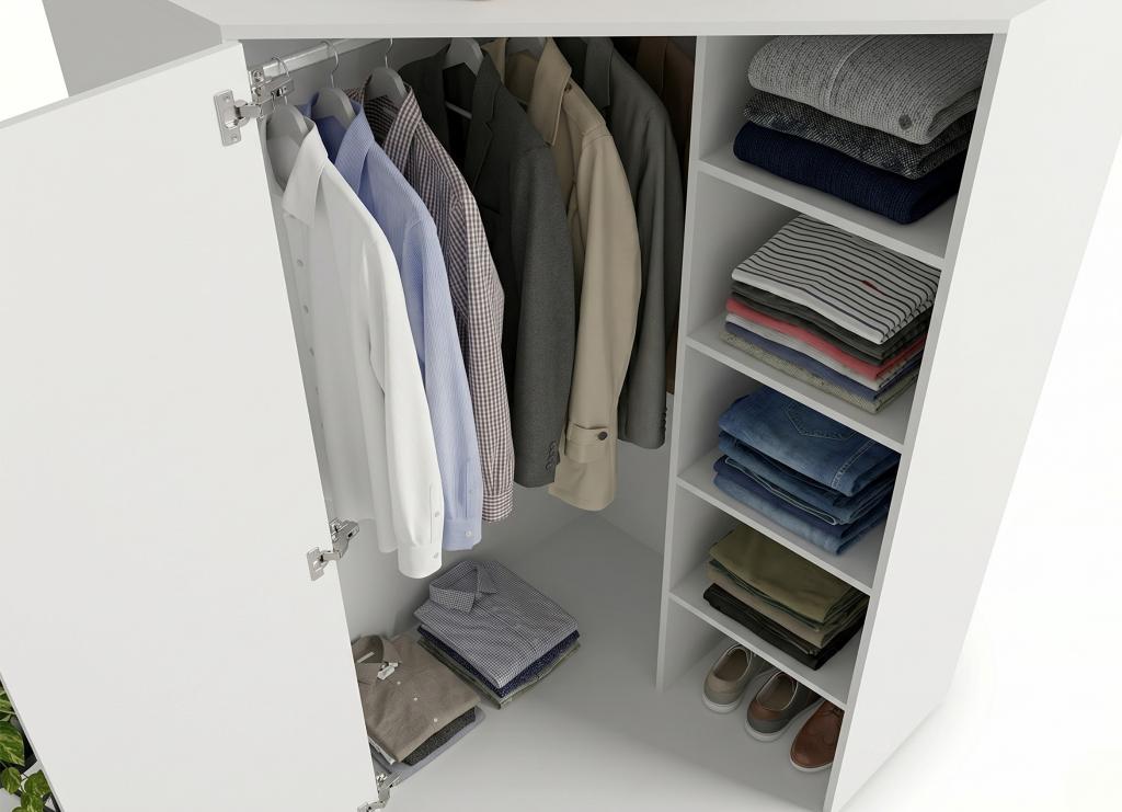 Główną zaletą mebli narożnych jest ich niesamowita zdolność do zagospodarowania tzw. „martwych punktów” w pomieszczeniu. Dzięki unikalnej konstrukcji, ta pojemna szafa narożna z drążkiem i półkami oferuje znacznie więcej miejsca do przechowywania niż standardowe modele o podobnej wielkości. Wnętrze zostało podzielone na dwie kluczowe strefy: wysoką sekcję z drążkiem, która pomieści płaszcze, koszule i marynarki, zapobiegając ich gnieceniu, oraz boczny systemem głębokich półek. Taki układ pozwala na perfekcyjną organizację – od ubrań sezonowych i pościeli, po obuwie, pudełka z akcesoriami czy odzież codzienną.