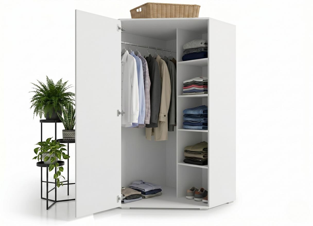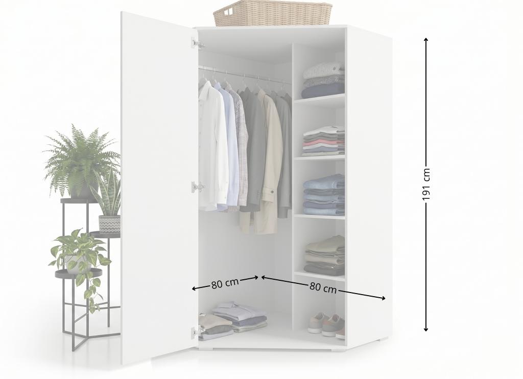 Ta biała szafa narożna o wysokości 191 cm to prawdziwa mistrzyni oszczędności miejsca. Jej minimalistyczny design idealnie wpisuje się w nowoczesne sypialnie, zamieniając puste kąty w niezwykle pojemną garderobę. Wnętrze wyposażone w solidny drążek oraz boczną sekcję z półkami gwarantuje zaskakującą ładowność i perfekcyjną organizację ubrań. Prosta bryła oraz jasna kolorystyka optycznie rozświetlają każde wnętrze, a funkcjonalny układ ułatwia codzienną segregację odzieży. To stylowe i kompaktowe rozwiązanie dla osób ceniących nowoczesną estetykę oraz nienaganny porządek.