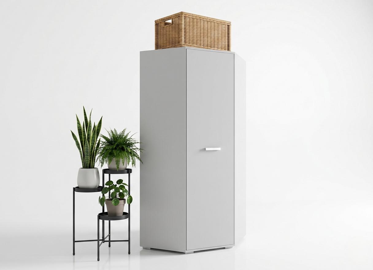 Wybierając ten model, inwestujesz w funkcjonalną garderobę, która sprawdzi się nawet w bardzo małym mieszkaniu. Stabilna konstrukcja i przemyślana wysokość 191 cm pozwalają na wykorzystanie górnej części mebla jako dodatkowej przestrzeni na dekoracyjne kosze czy organizery. Jasna kolorystyka szafy rozświetla wnętrze i wprowadza do niego ład oraz harmonię. To mebel, który łączy w sobie cechy kompaktowej szafki z pojemnością pełnowymiarowej garderoby, stanowiąc odpowiedź na potrzeby nowoczesnych użytkowników szukających trwałych i estetycznych rozwiązań meblowych.