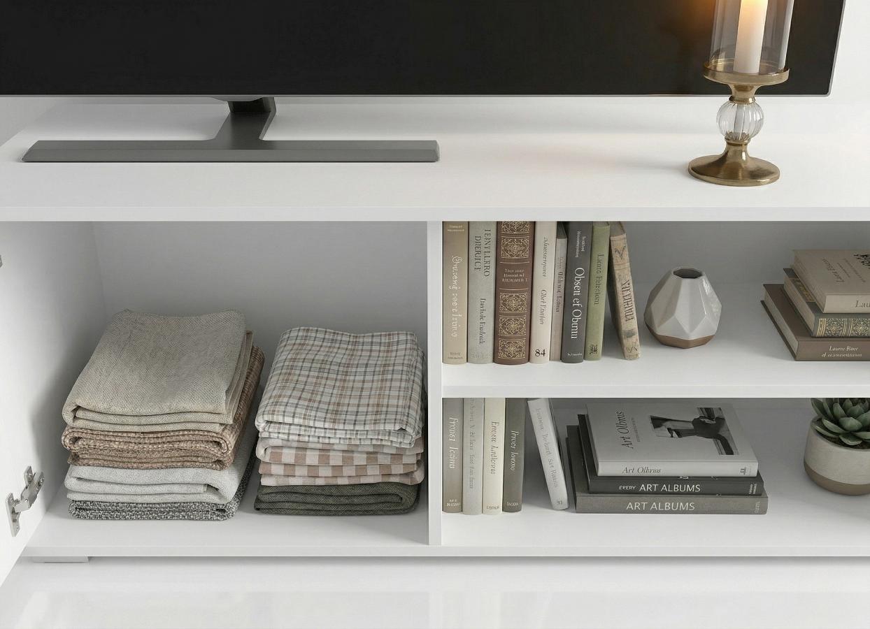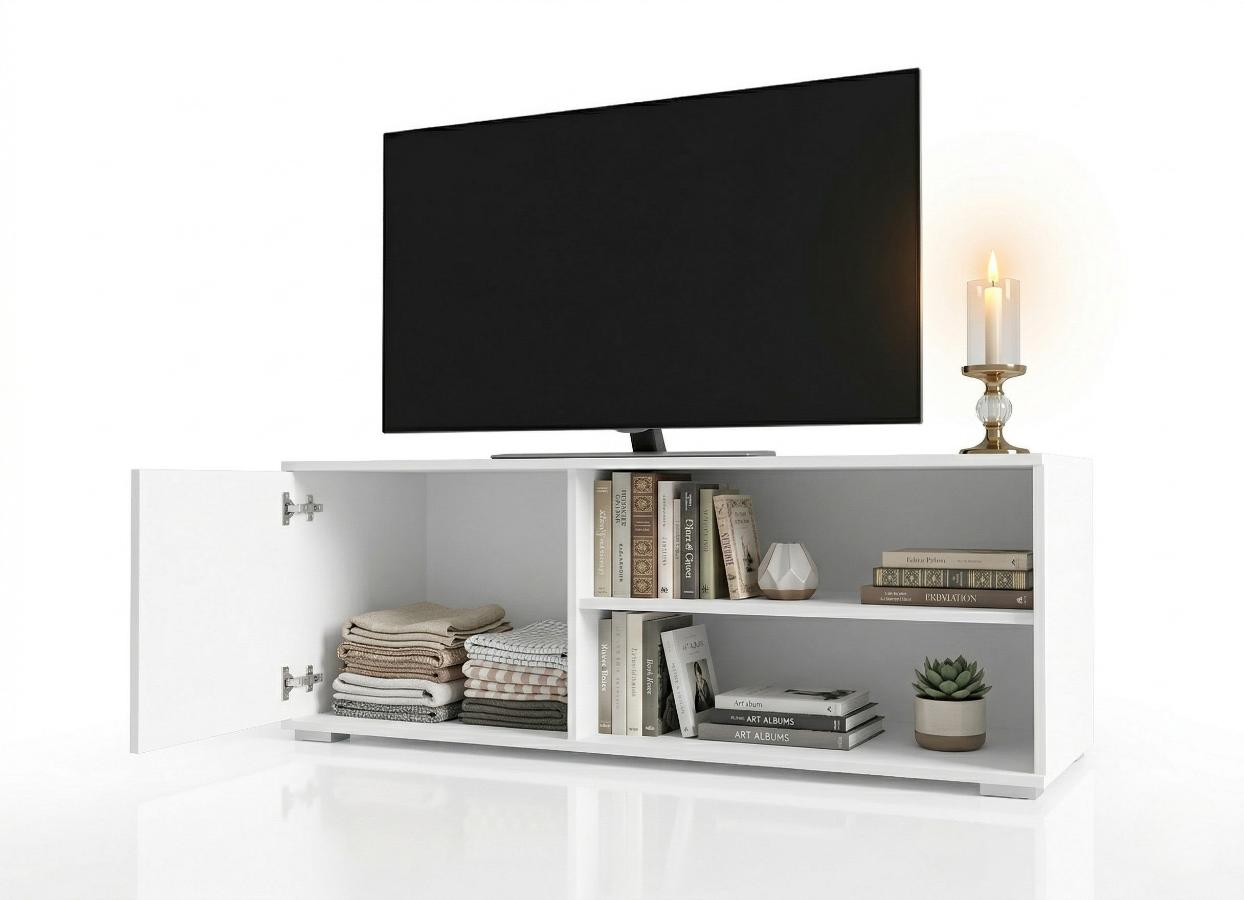 Ta biała szafka RTV to skandynawski szyk i mistrzowska organizacja. Dzięki wymiarom 100×50 cm idealnie pasuje do salonu, łącząc pojemną szafkę na szpargały z otwartymi wnękami na sprzęt i albumy. Matowe wykończenie dodaje wnętrzu lekkości, a solidny blat to bezpieczna baza pod TV. Stylowy minimalizm, który wprowadza do domu wizualny ład i nowoczesny, świeży klimat, który pokochasz od pierwszego wejrzenia.