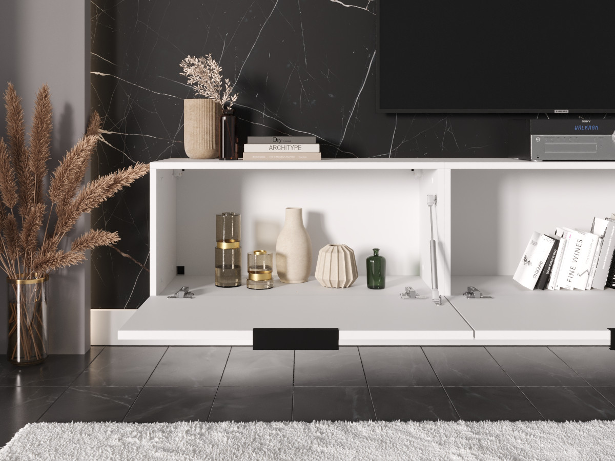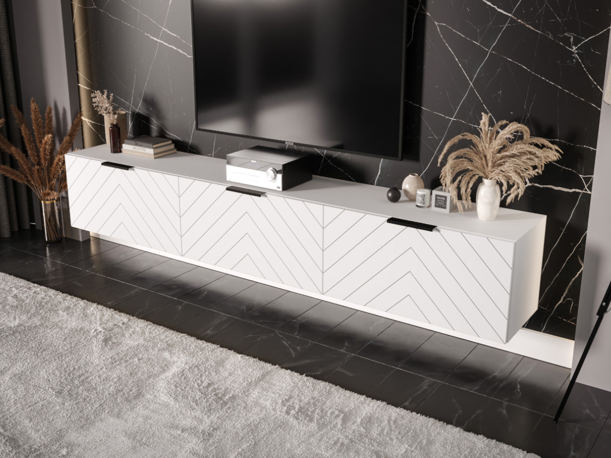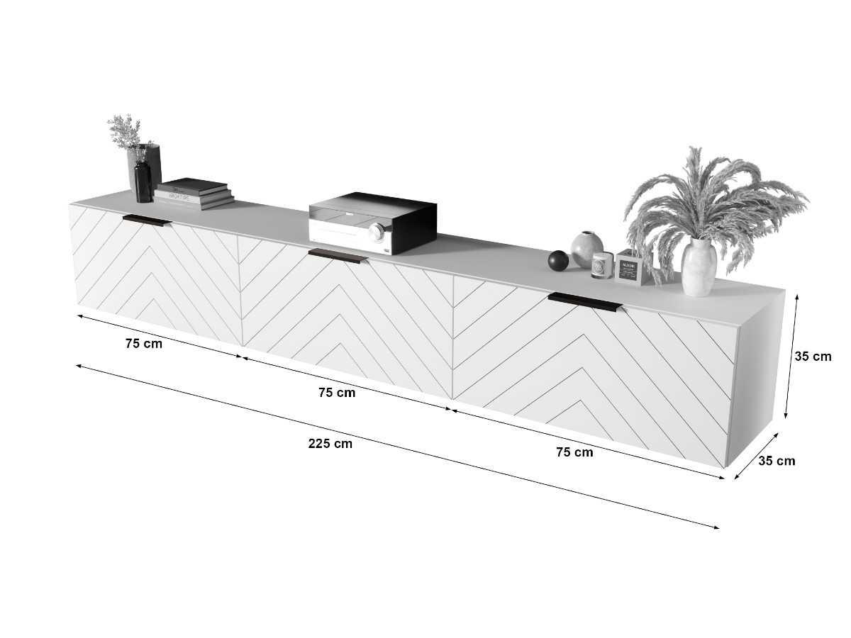 Białe Meble RTV 225 cm MONACO to zestaw składający się z 3 niezależnych segmentów wiszących – szafek – które możesz zamontować symetrycznie lub w nieregularnym układzie, dopasowując je do rozmiarów pomieszczenia, wysokości telewizora czy indywidualnych preferencji. Wisząca forma mebli zapewnia lekkość wizualną i sprawia, że całość wygląda nowocześnie i przestronnie.