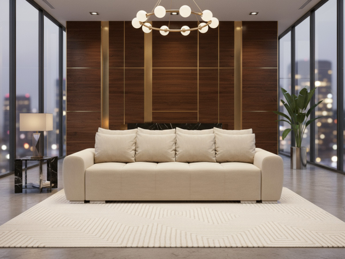 Duża Kanapa Rozkładana 265 cm ATENA – ten model to kwintesencja nowoczesnego designu i najwyższej jakości rzemiosła. Jej elegancka forma, tapicerowany tył oraz starannie dopracowane detale sprawiają, że doskonale prezentuje się zarówno przy ścianie, jak i w centralnym punkcie salonu. To mebel, który przyciąga wzrok i zapewnia wyjątkowy komfort użytkowania.