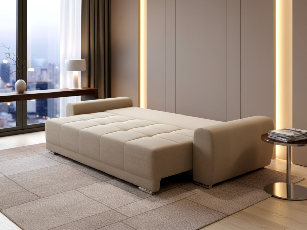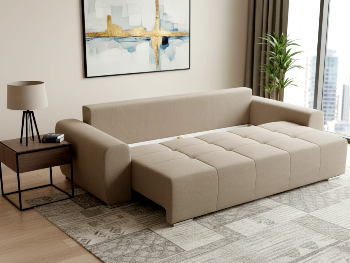 Dzięki temu możesz łatwo przygotować wygodne miejsce dla gości lub zyskać przestrzeń do codziennego wypoczynku, bez potrzeby przesuwania mebli czy skomplikowanego montażu. To rozwiązanie łączy komfort spania z funkcjonalnością i nowoczesnym designem, sprawiając, że sofa staje się naprawdę wszechstronnym meblem w Twoim salonie.