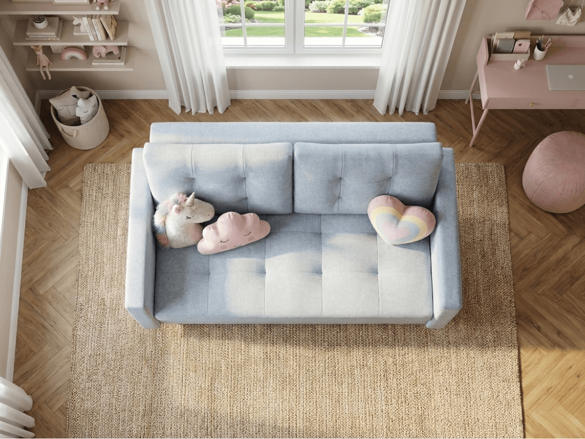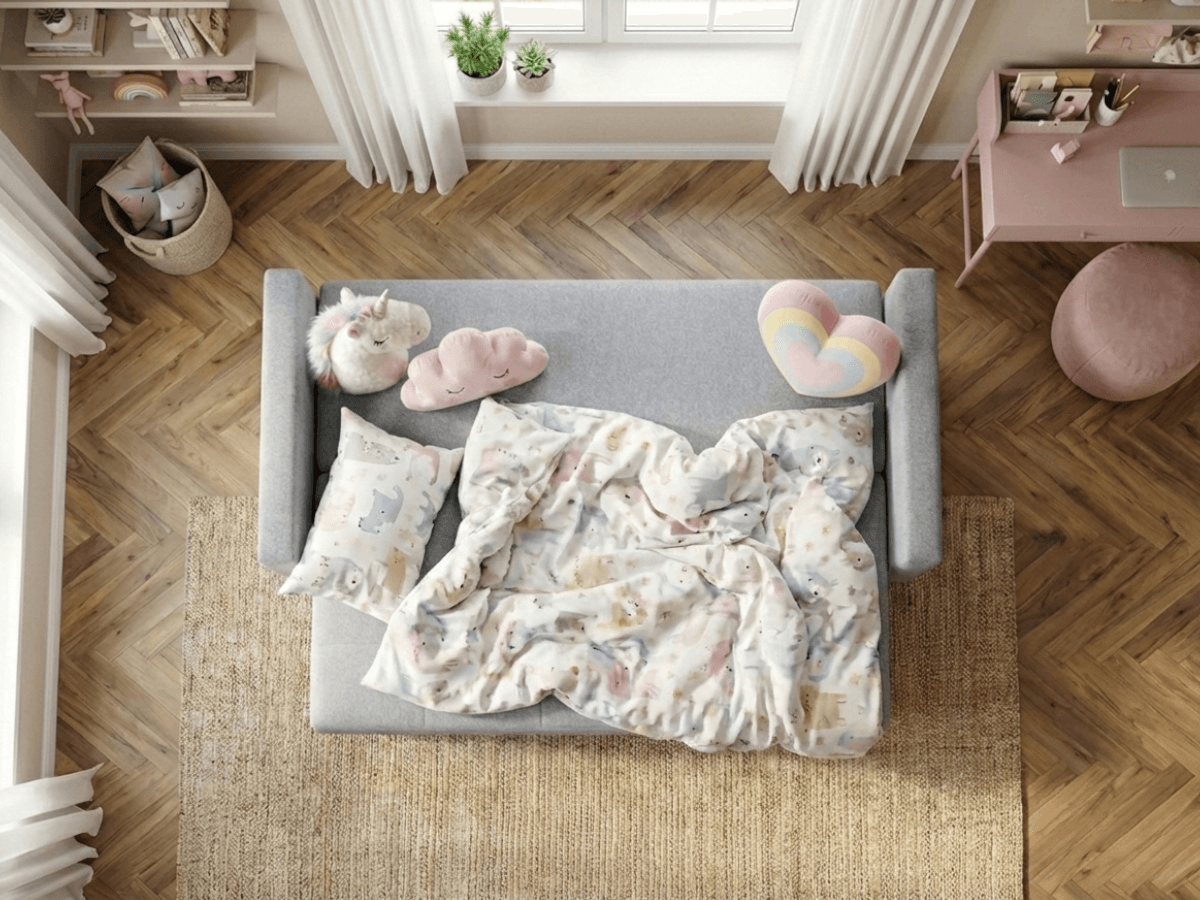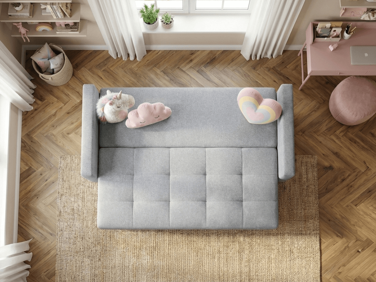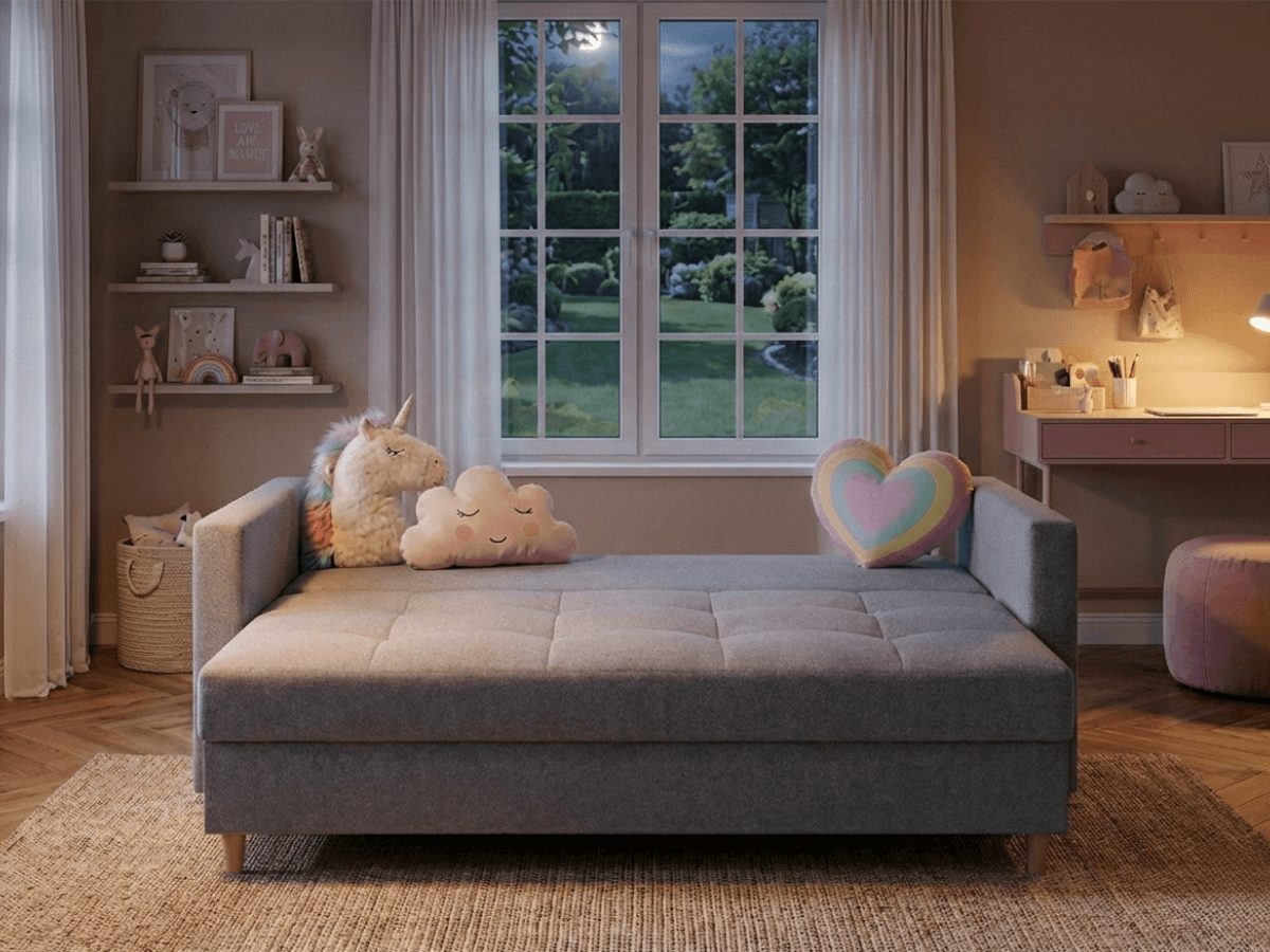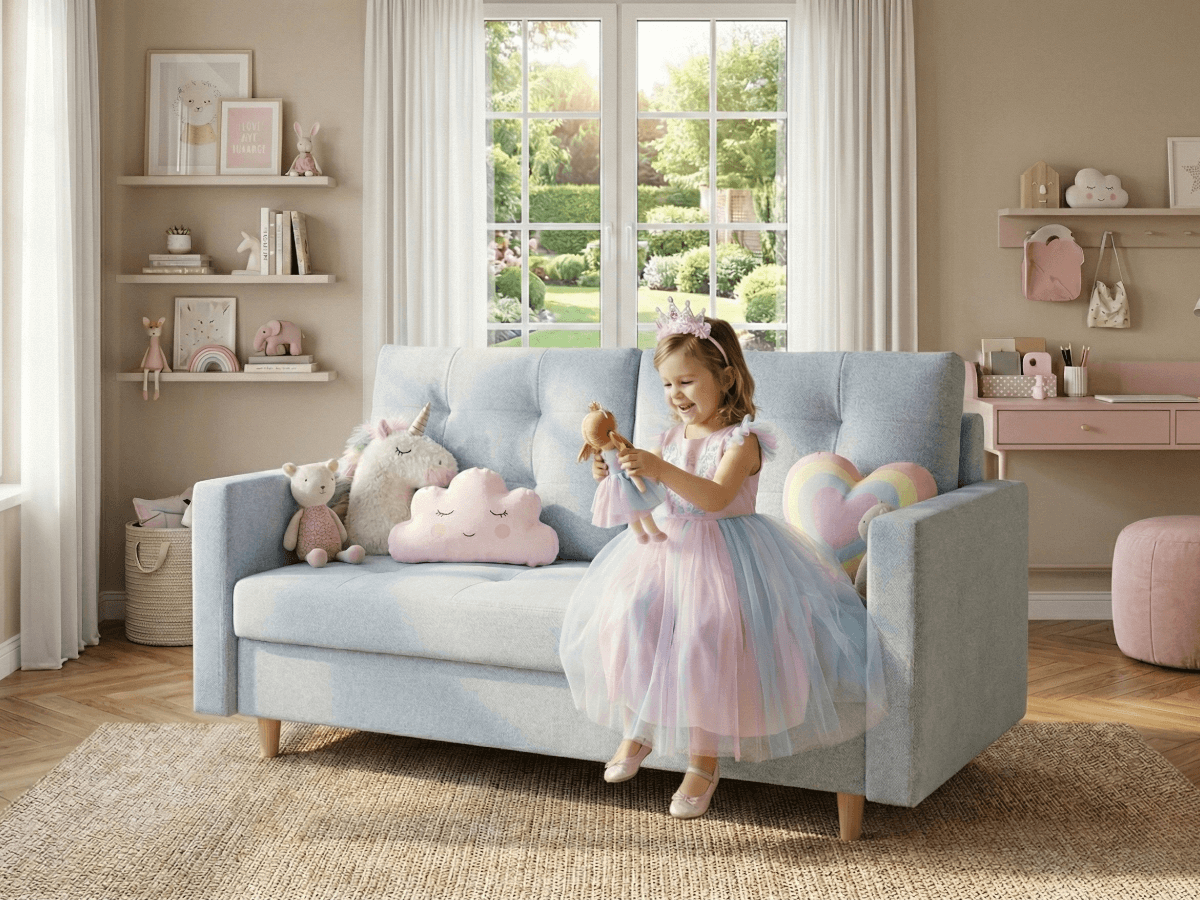 Wystarczy jeden rzut oka na nasze aranżacje, by przekonać się, jak wdzięcznym meblem jest kanapa dziecięca 155 cm TEMPE. Jej uniwersalna tapicerka sprawia, że sofa doskonale odnajdzie się w każdej aranżacji – od pastelowego królestwa małej księżniczki, pełnego jednorożców i miękkich poduszek, po bardziej stonowany pokój nastolatka.