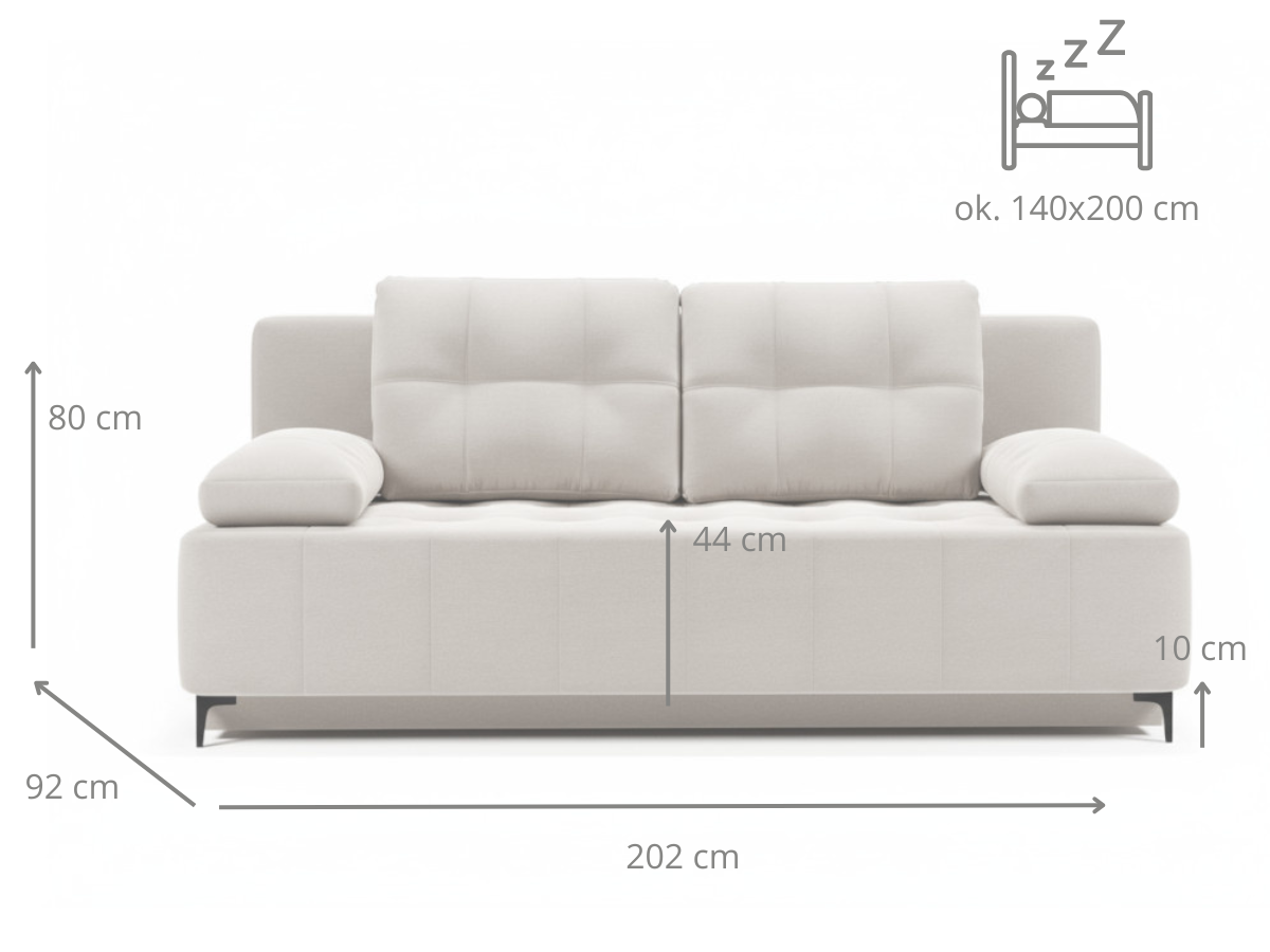 Kanapa Rozkładana 202 cm VIKKA z funkcją spania oferuje przestronną powierzchnię 140 × 200 cm, porównywalną z dwuosobowym łóżkiem, dzięki czemu idealnie sprawdzi się zarówno dla domowników, jak i dla gości. Siedzisko ma średnio miękką twardość (około H2), co zapewnia komfortowy wypoczynek, a jednocześnie stabilne podparcie ciała podczas snu.