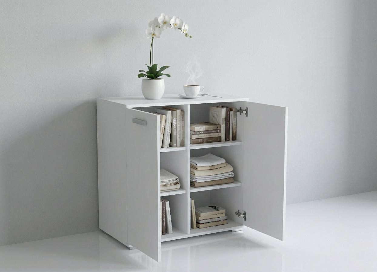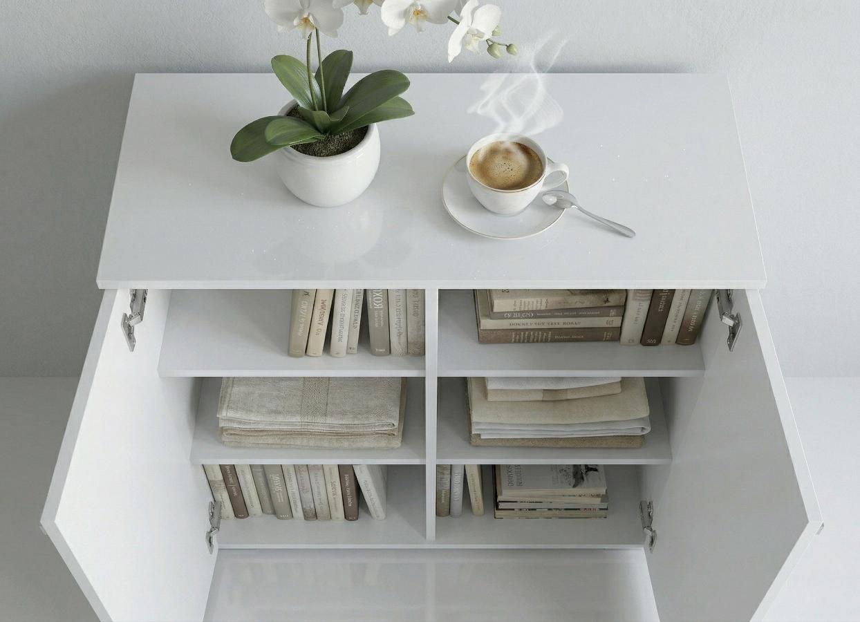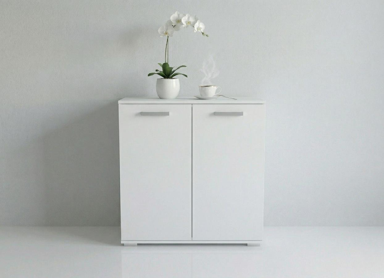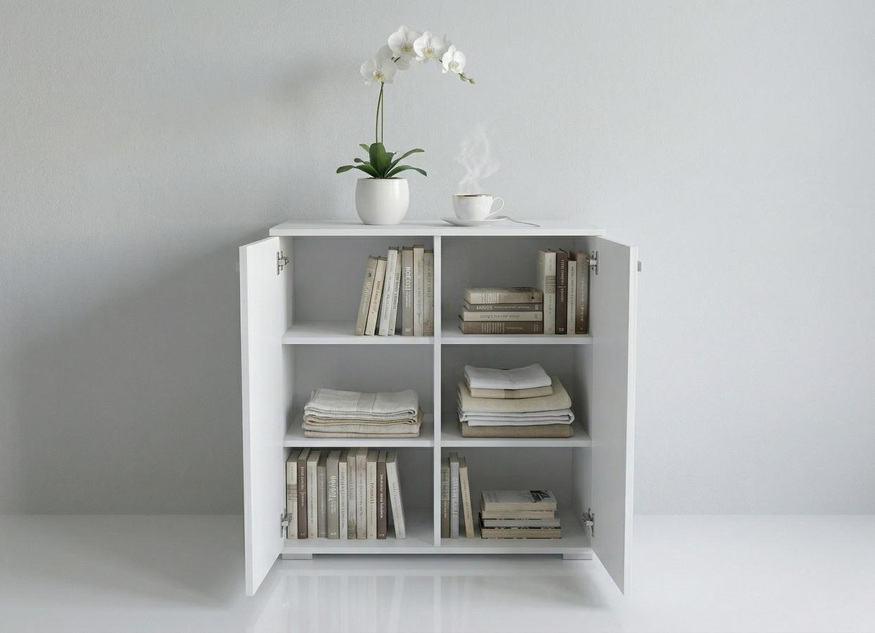 Wyposażona w dwa solidne drzwiczki, skrywa w swoim wnętrzu cztery przestronne półki (tworzące łącznie sześć przegródek), co zapewnia mnóstwo miejsca na książki, tekstylia, dokumenty czy inne drobiazgi, ułatwiając utrzymanie porządku. To nie tylko stylowa biała komoda do salonu, ale również praktyczna szafka do sypialni na ubrania lub pościel. Całość dopełniają dyskretne, podłużne, srebrne uchwyty, które ułatwiają otwieranie i podkreślają jej nowoczesny charakter.
