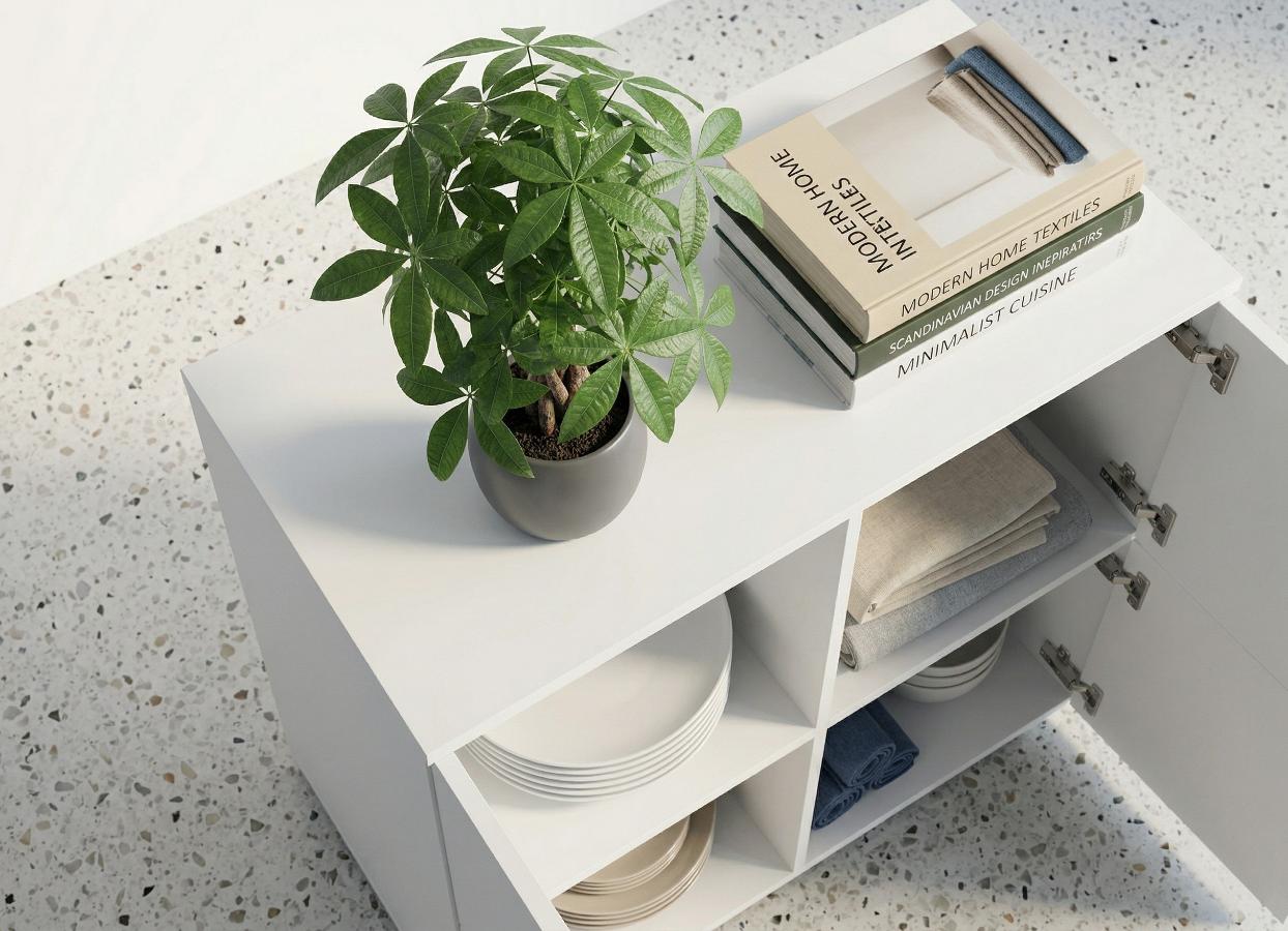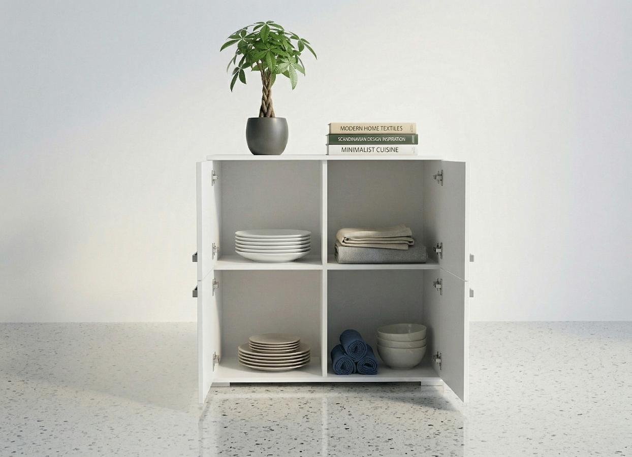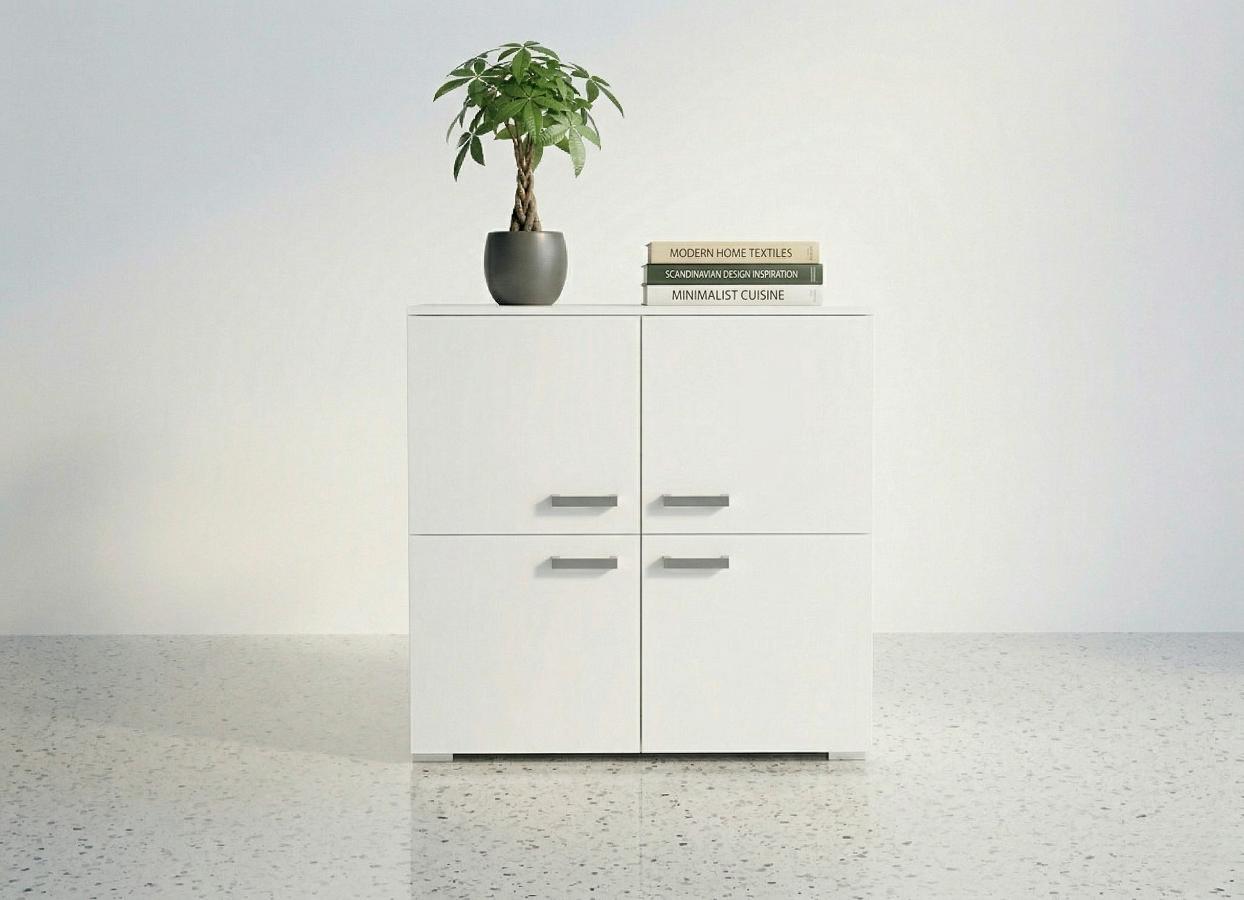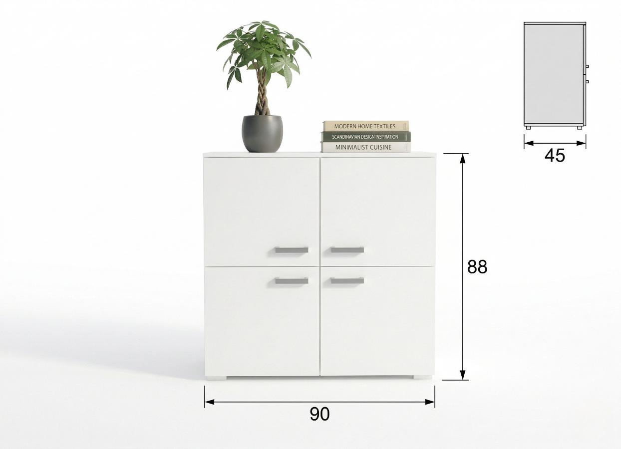 Ta nowoczesna komoda o wymiarach 90x88x45 cm to stylowy i funkcjonalny element każdego współczesnego wnętrza. Wyposażono ją w cztery uchylne fronty, które kryją wewnątrz cztery pojemne wnęki idealne do segregacji domowych akcesoriów czy naczyń. Minimalistyczna bryła ze srebrnymi uchwytami optycznie rozjaśnia pomieszczenie, nadając mu nowoczesnego, świeżego charakteru. Dzięki optymalnej głębokości mebel oferuje mnóstwo miejsca do przechowywania, nie zajmując przy tym zbyt wiele przestrzeni w salonie czy jadalni.