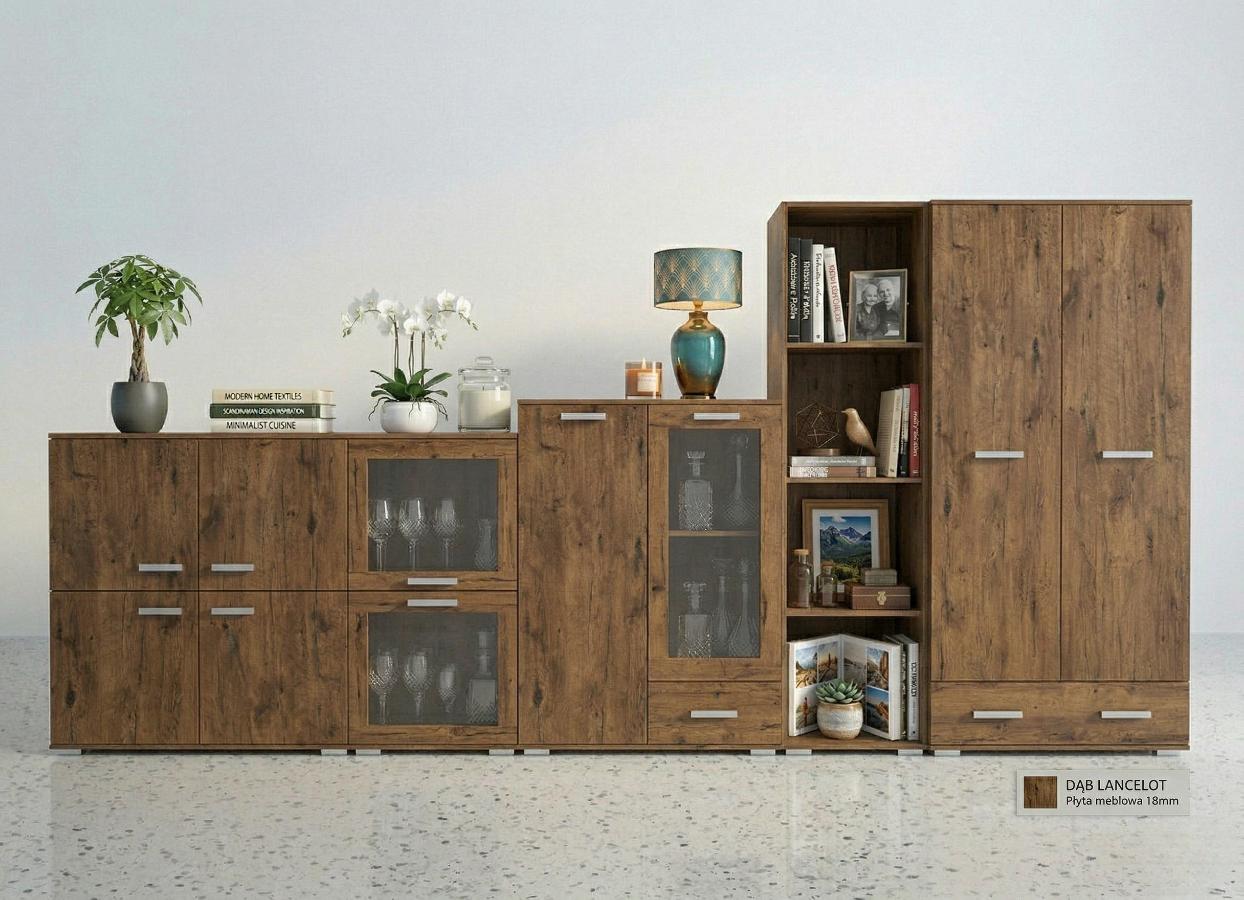 Dopełnieniem zestawu są eleganckie witryny szklane, które stanowią idealne miejsce na wyeksponowanie pamiątek rodzinnych, kolekcji szkła czy domowej biblioteczki.