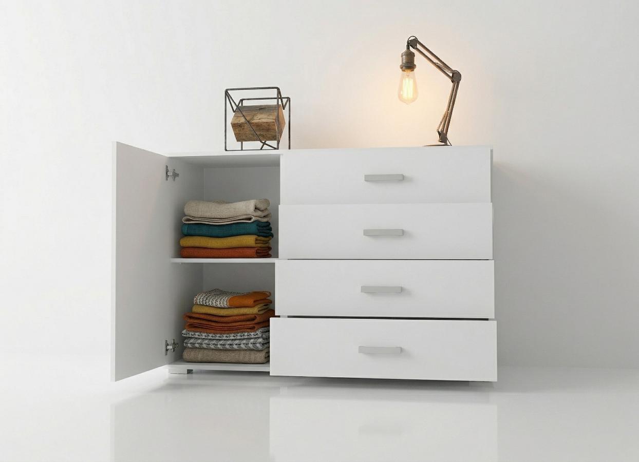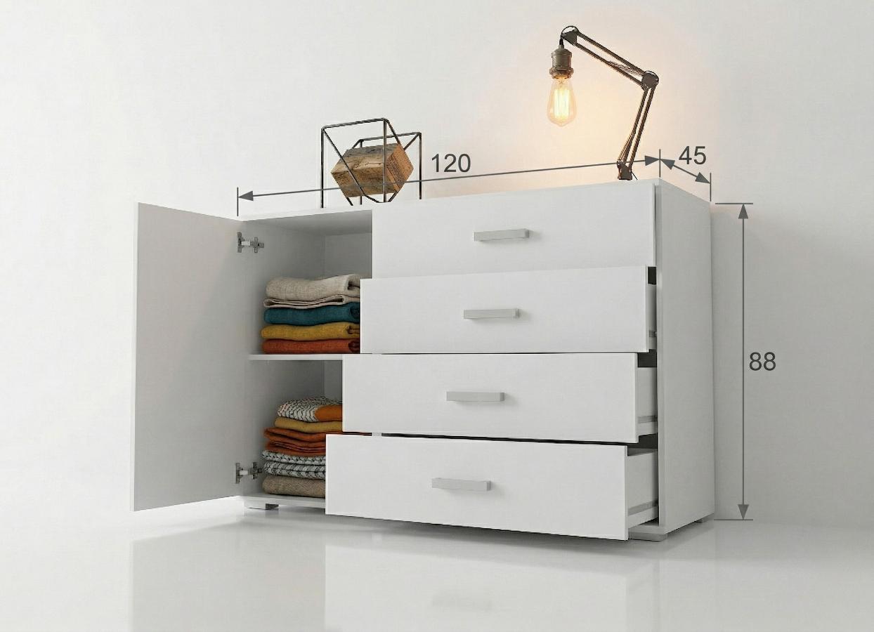 Mebel jest niezwykle funkcjonalny: cztery głębokie szuflady oraz pojemna szafka z półkami gwarantują miejsce na wszystko – od garderoby w sypialni, po dokumenty w salonie. Dzięki wymiarom 120x88x45 cm komoda jest ustawna i solidna, a jej szeroki blat to wymarzona przestrzeń na dekoracje. To mebel, który nie tylko organizuje przestrzeń, ale staje się jej stylową wizytówką.