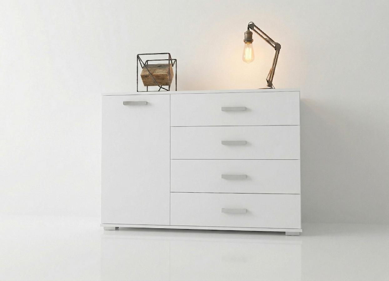 Ta nowoczesna biała komoda z szufladami 120 cm Trend 7 to absolutna kwintesencja współczesnego designu, która łączy w sobie surowy minimalizm z maksymalną funkcjonalnością. Jej nienaganna, śnieżnobiała bryła natychmiast rozświetla każde pomieszczenie, wprowadzając do niego ład, harmonię i pożądane poczucie przestronności. Jest to idealny wybór zarówno do mniejszych mieszkań, które potrzebują optycznego powiększenia, jak i do reprezentacyjnych, dużych salonów. Wygląd mebla opiera się na prostych, geometrycznych liniach, które zostały subtelnie przełamane przez eleganckie, srebrzyste uchwyty o linearnym kształcie. To właśnie te detale nadają całości nowoczesnego, nieco industrialnego sznytu, tworząc spójną kompozycję z matowym wykończeniem frontów.