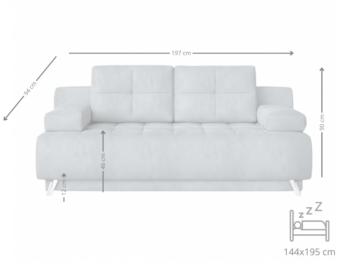 Mała Rozkładana Kanapa 197 cm NOVA z pojemnikiem na pościel to doskonałe rozwiązanie dla osób, które cenią sobie wielofunkcyjność mebli. Łączy w sobie wygodę miejsca do siedzenia, przestrzeń do spania oraz praktyczny schowek, który pomaga utrzymać porządek w pomieszczeniu. Dzięki temu jest to mebel idealny zarówno do małych mieszkań, jak i dużych salonów, gdzie pełni rolę zarówno użytkową, jak i dekoracyjną.