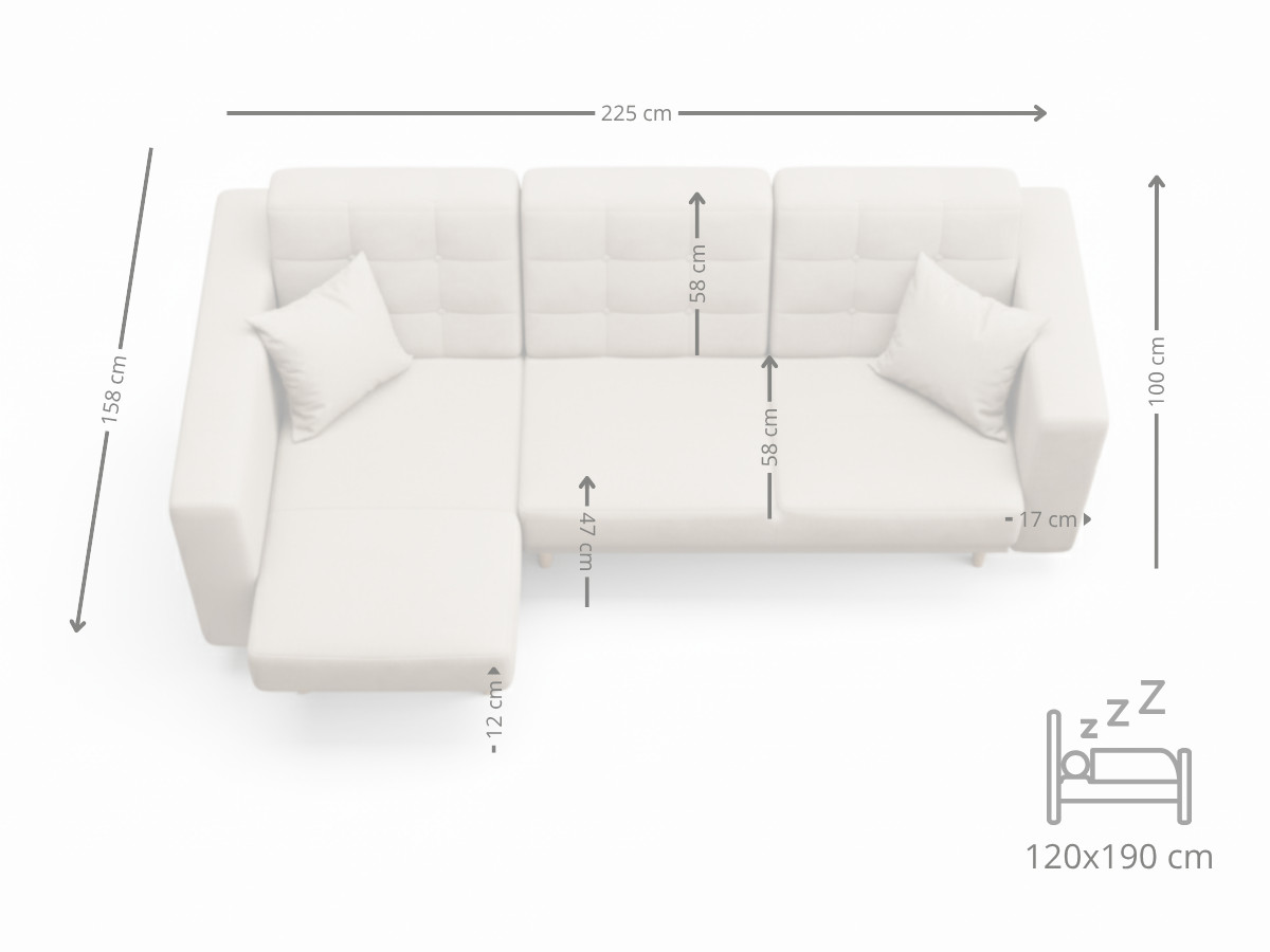 - Szerokość: 225 cm | Głębokość: 158 cm | Wysokość: 100 cm