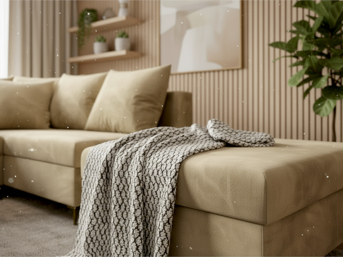 Praktyczny pojemnik na pościel, ukryty pod siedziskiem, to idealne rozwiązanie dla osób, które cenią porządek i funkcjonalność. Pozwala w łatwy sposób przechowywać koce, poduszki czy pościel, utrzymując salon w czystości i porządku.