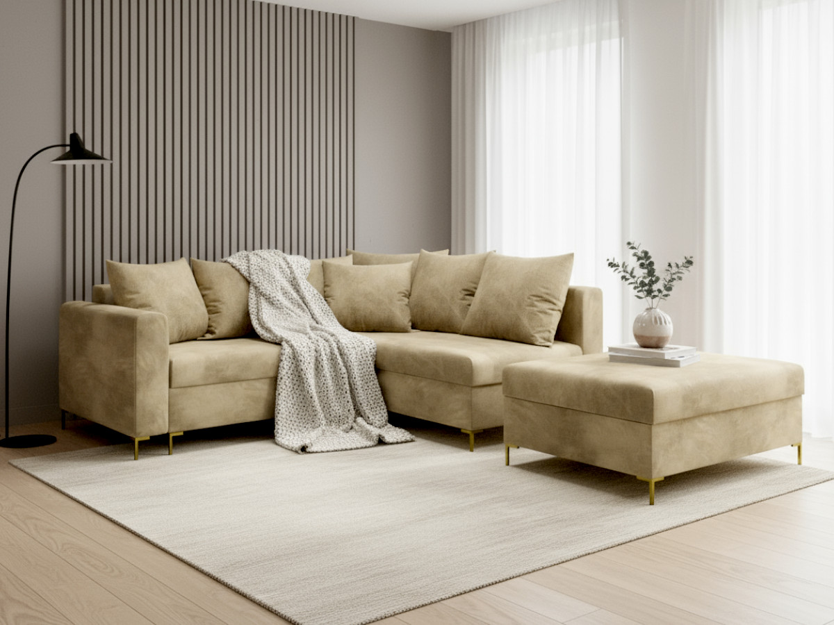 To rozwiązanie, które pozwala w kilka chwil zmienić układ mebla, dopasowując go do aktualnych potrzeb użytkowników. Pufa może pełnić także funkcję praktycznego podnóżka lub niskiego stolika, wystarczy położyć na niej tacę z napojami lub dekoracje. Jej solidne wykonanie zapewnia stabilność i trwałość, a miękkie siedzisko zapewnia komfort użytkowania. Dzięki wysokim nóżkom pufa zachowuje spójny charakter z narożnikiem i prezentuje się lekko oraz nowocześnie.