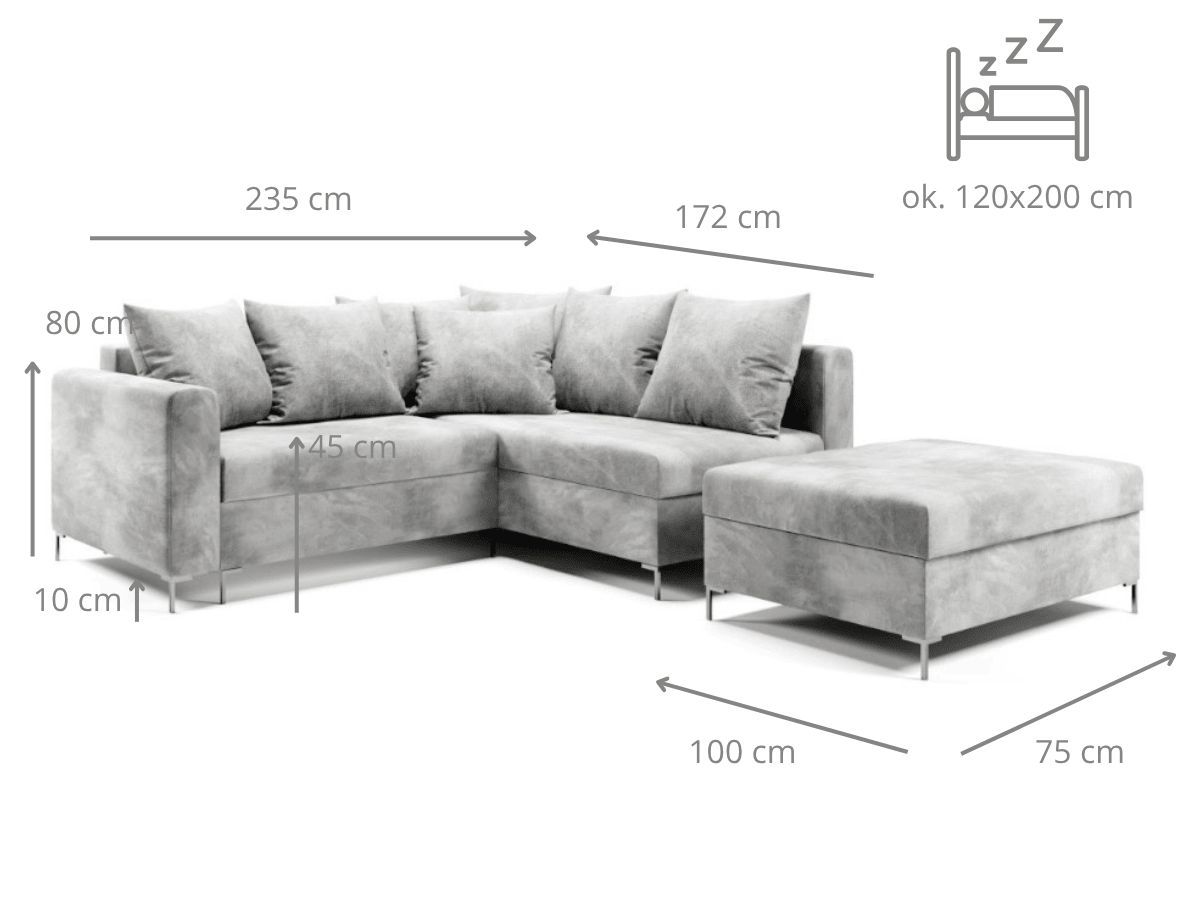 Rozkładany Narożnik 235x172 CM Z Dużą Pufą W Zestawie + Funkcja Spania Pojemnik + Kolory - MOON