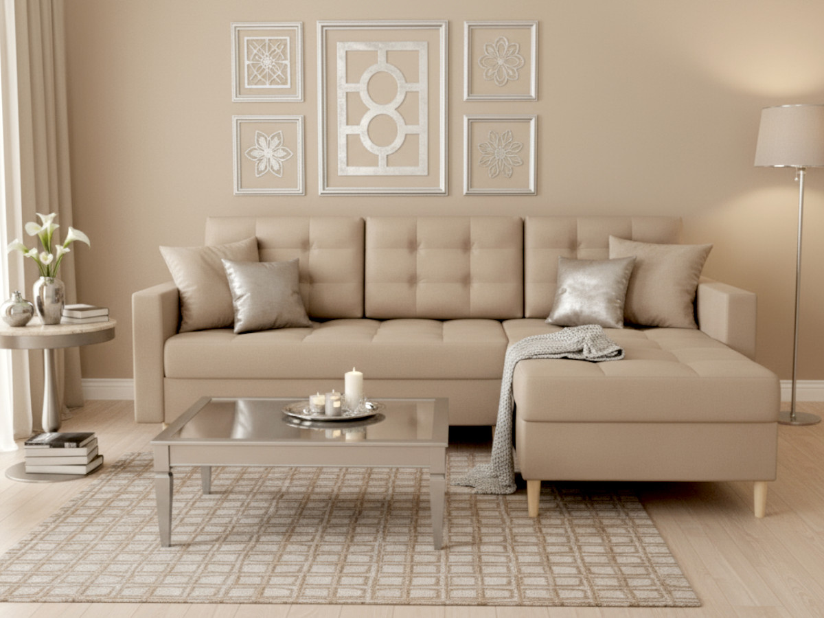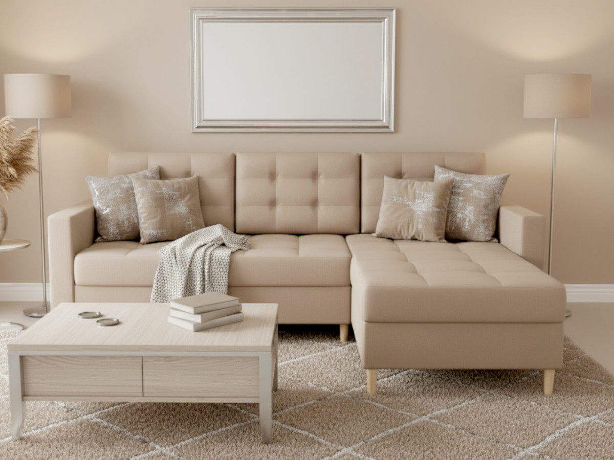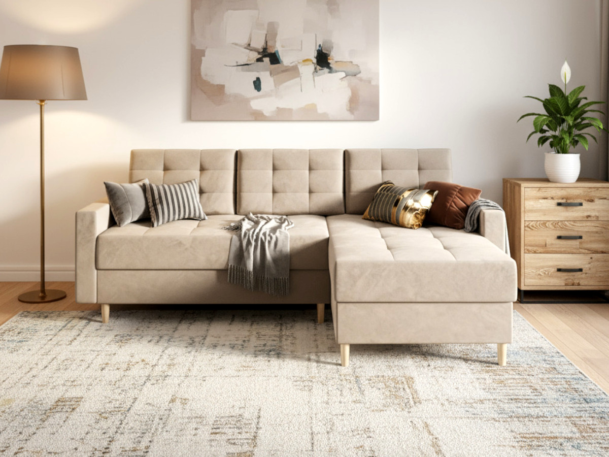 Pikowany narożnik w stylu skandynawskim to idealne rozwiązanie dla osób ceniących połączenie funkcjonalności, komfortu i estetyki. Jego przytulny charakter podkreślony pikowanymi detalami wprowadza ciepło do każdego wnętrza, a minimalistyczny design i neutralna kolorystyka czynią go uniwersalnym wyborem. Jest to mebel, który doskonale łączy skandynawską prostotę z odrobiną elegancji, zapewniając wygodę i trwałość na lata.