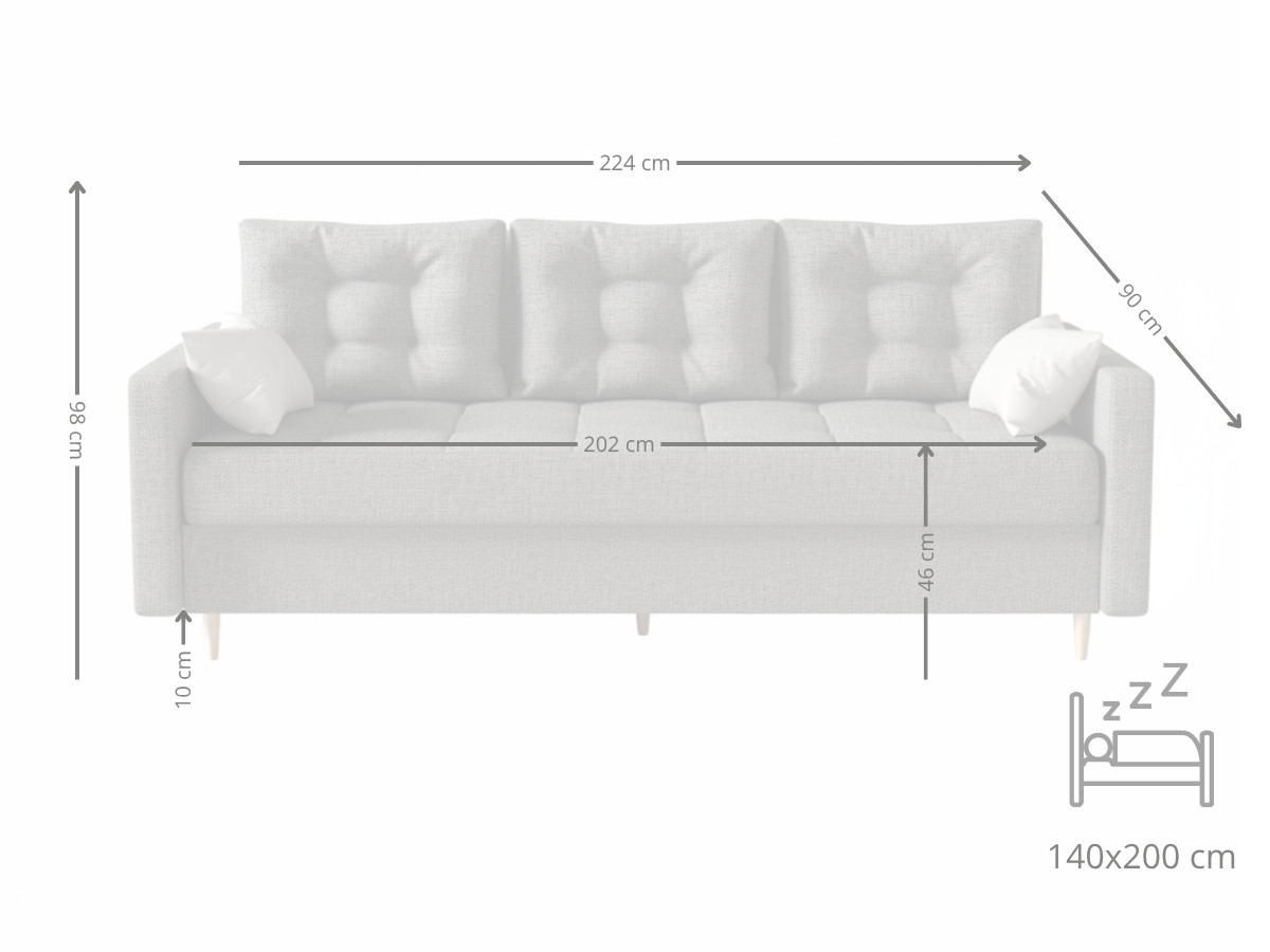 Kanapa Rozkładana 202 cm VIKKA - Mebel o długości 202 cm to praktyczna, 3-osobowa sofa zaprojektowana z myślą o oszczędności miejsca. Mechanizm rozkładania pozwala szybko zmienić sofę w wygodne miejsce do spania, co czyni ją funkcjonalnym meblem do pokoju młodzieżowego.