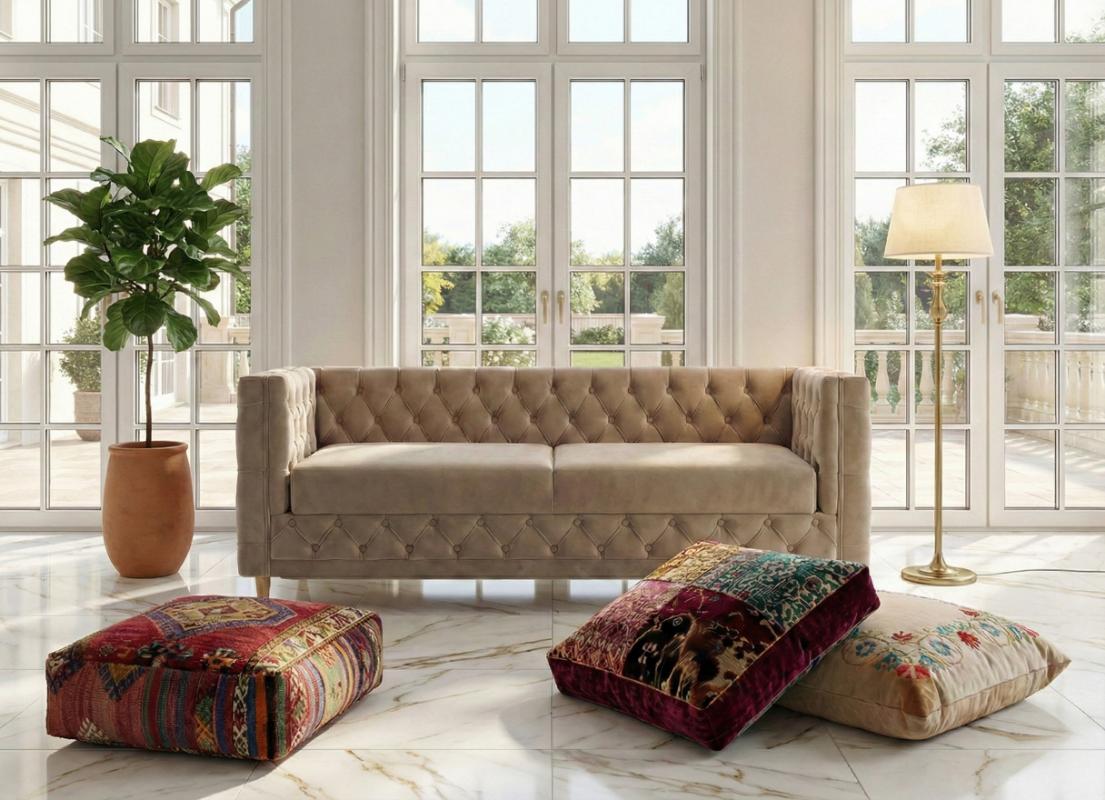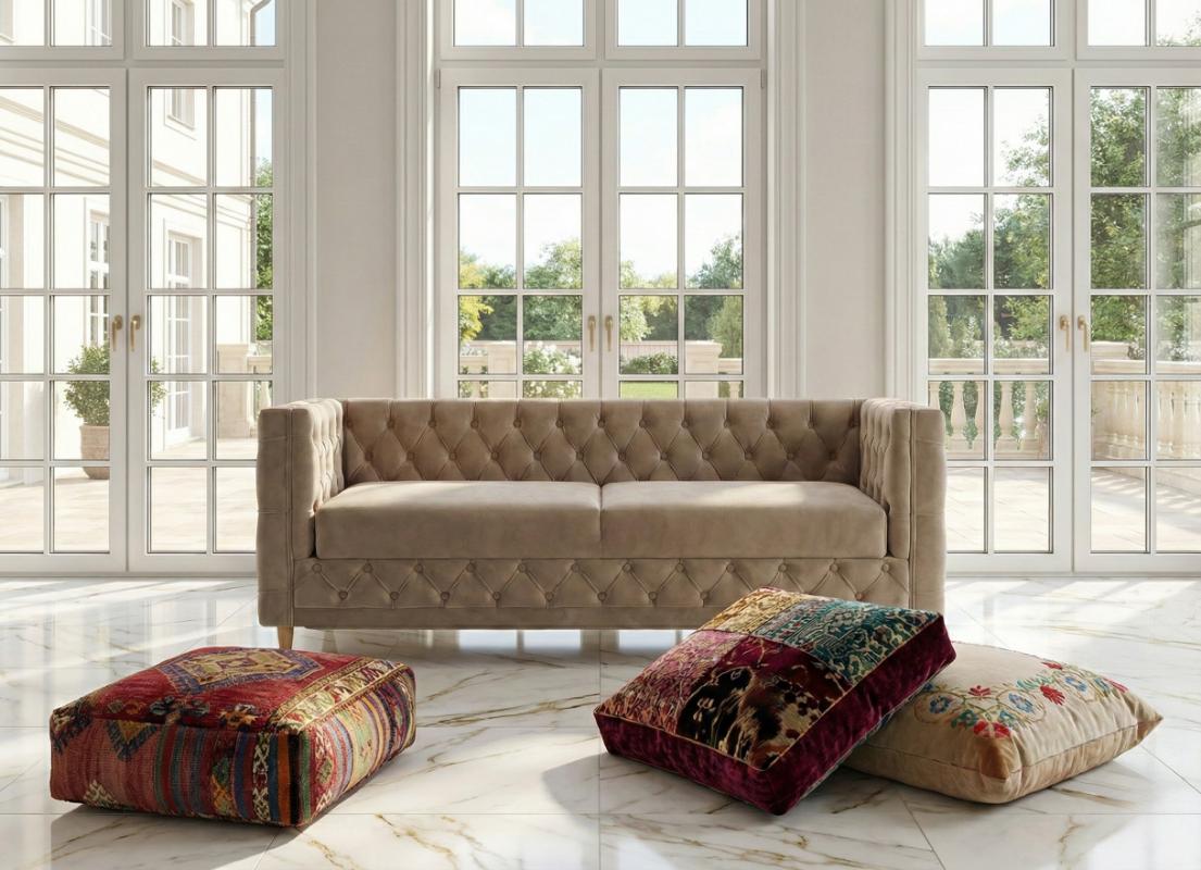 Tkanina ta nie tylko pięknie wygląda, ale jest też niezwykle praktyczna i wytrzymała, zapewniając, że Sofa Chesterfield 182 cm Aspen zachowa swój nieskazitelny wygląd przez lata. Beżowa kolorystyka (widoczna na załączonych aranżacjach) jest niezwykle uniwersalna. Stanowi idealną bazę, która wprowadza do wnętrza spokój, harmonię i ciepło, doskonale komponując się zarówno z chłodnym marmurem na podłodze, jak i naturalnym drewnem.