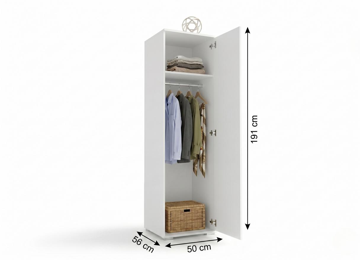 Ta nowoczesna biała szafa jednodrzwiowa (50 cm) to mistrzowskie połączenie minimalizmu i ergonomii. Przy wysokości 191 cm i głębokości 56 cm, ten regał zamknięty oferuje mnóstwo miejsca, nie przytłaczając wnętrza. Wnętrze z górną półką oraz drążkiem na ubrania idealnie segreguje garderobę w sypialni lub przedpokoju. Gładkie fronty w kolorze czystej bieli optycznie powiększają przestrzeń, nadając jej nowoczesnego szyku. To stylowy wybór dla każdego, kto ceni porządek w kompaktowym wydaniu.