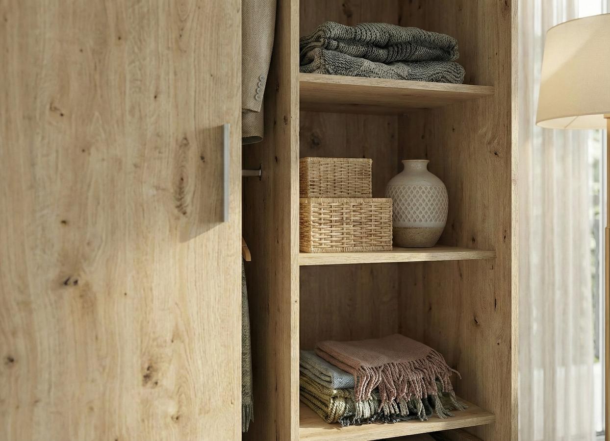 Kluczem do sukcesu szafy o szerokości 180 cm jest jej wewnętrzna architektura, oparta na sprawdzonym schemacie trzech skrzydeł drzwiowych. Taki układ pozwala na precyzyjny podział przestrzeni na strefy: jedną dedykowaną ubraniom wiszącym na solidnych drążkach oraz drugą, wypełnioną pojemnymi półkami na odzież złożoną, tekstylia domowe czy akcesoria. Trzydrzwiowa konstrukcja ułatwia dostęp do konkretnej części garderoby bez konieczności odsłaniania całej zawartości mebla, co wpływa na ergonomię codziennego poranka.