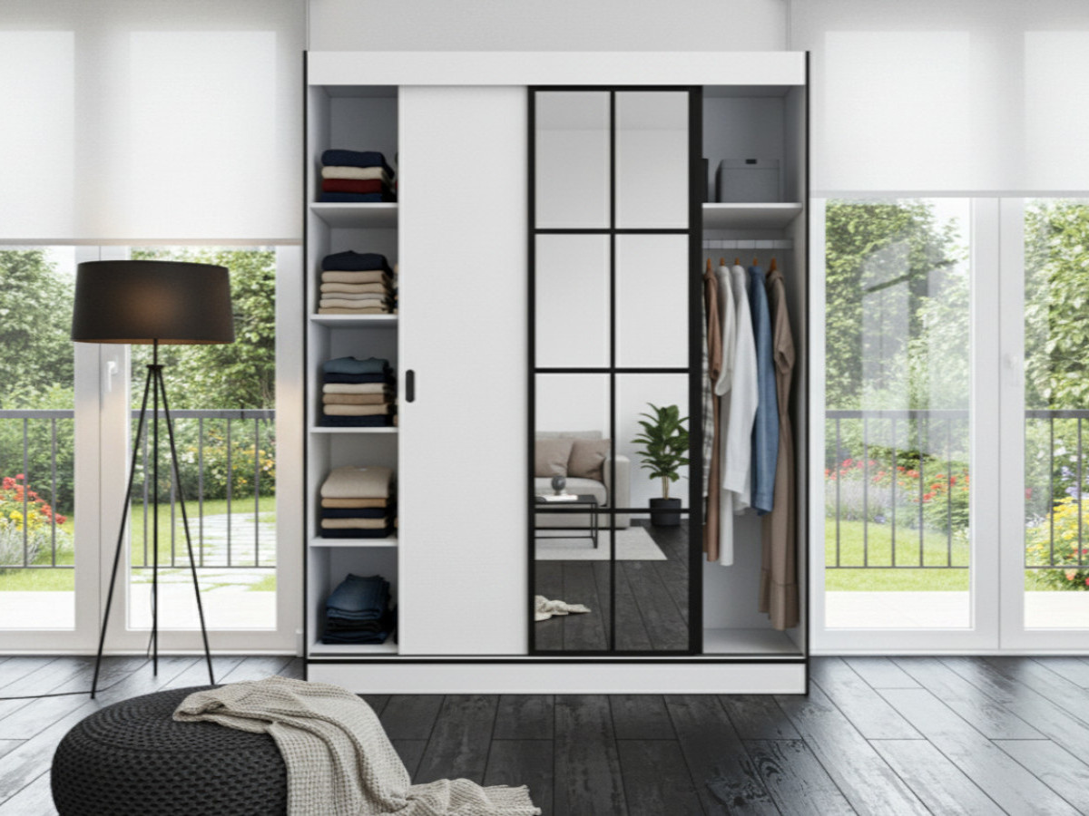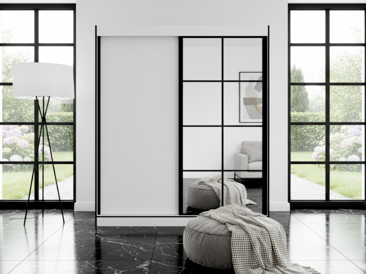 Czarne obramowanie całej szafy oraz kontrastujące profile boczne działają niczym odważny, graficzny kontur, który podkreśla jej geometryczną, zdecydowaną formę. Dzięki temu Szafa biała 2-drzwiowa 180 cm Milton 2 idealnie wpisuje się w monochromatyczne wnętrza, dodając im charakteru i sznytu. Lustro ze szprosami pełni tu podwójną rolę: funkcjonalną, pozwalając na swobodne przejrzenie sylwetki, oraz aranżacyjną – spektakularnie odbija światło i przestrzeń ogrodu czy salonu widoczną w tle naszych aranżacji, co optycznie podwaja metraż pomieszczenia.