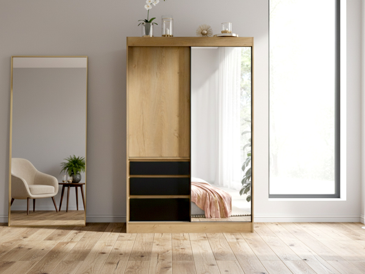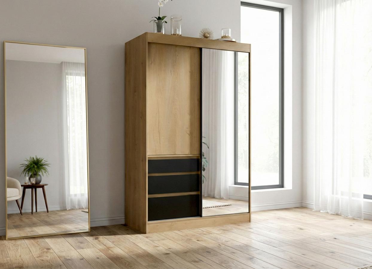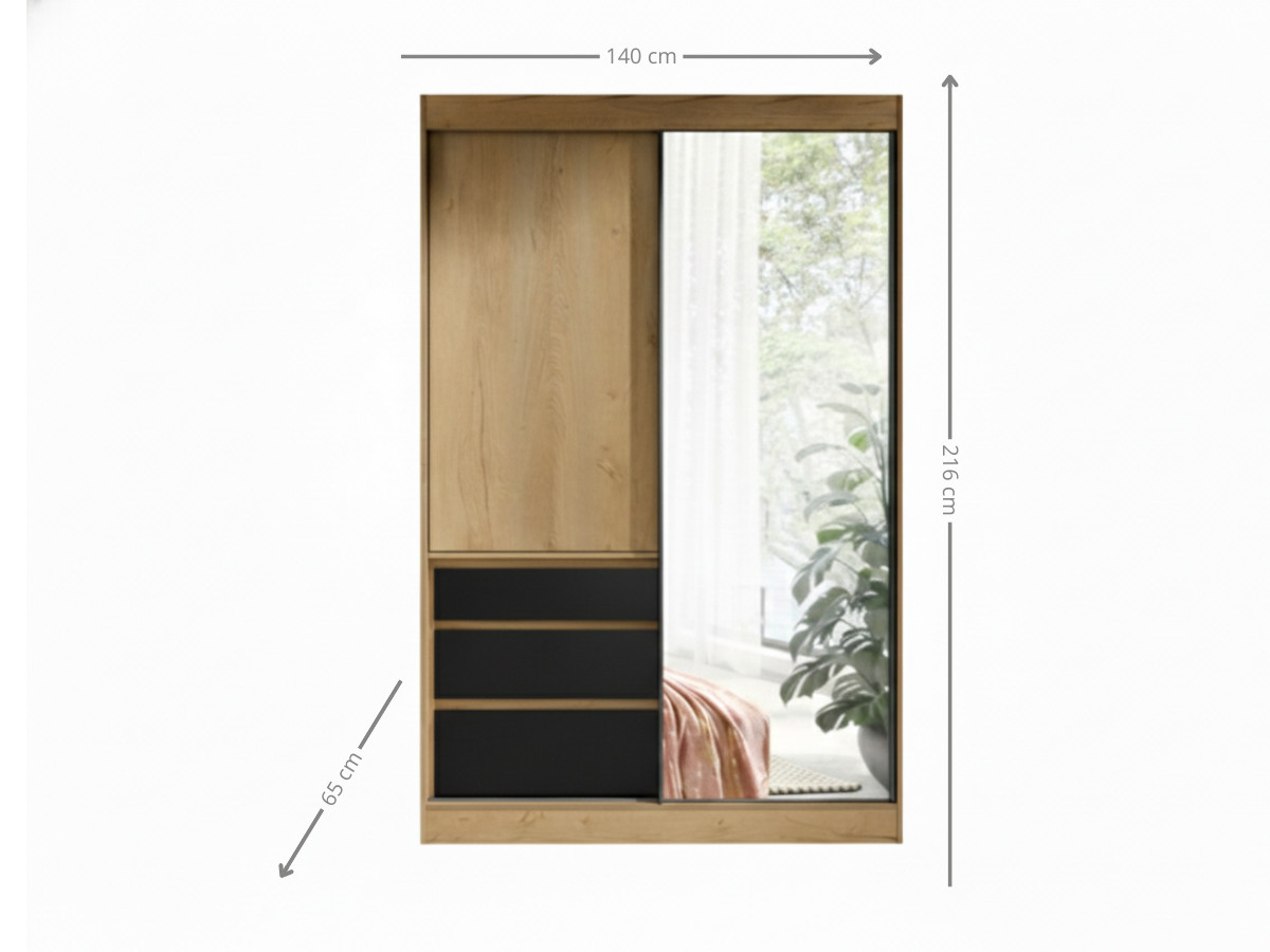 Szafa Z Szufladami Flin 140 cm – Garderoba Przesuwna Z Lustrem 2-Drzwiowa Dąb Lefkas