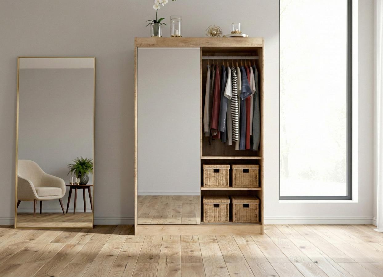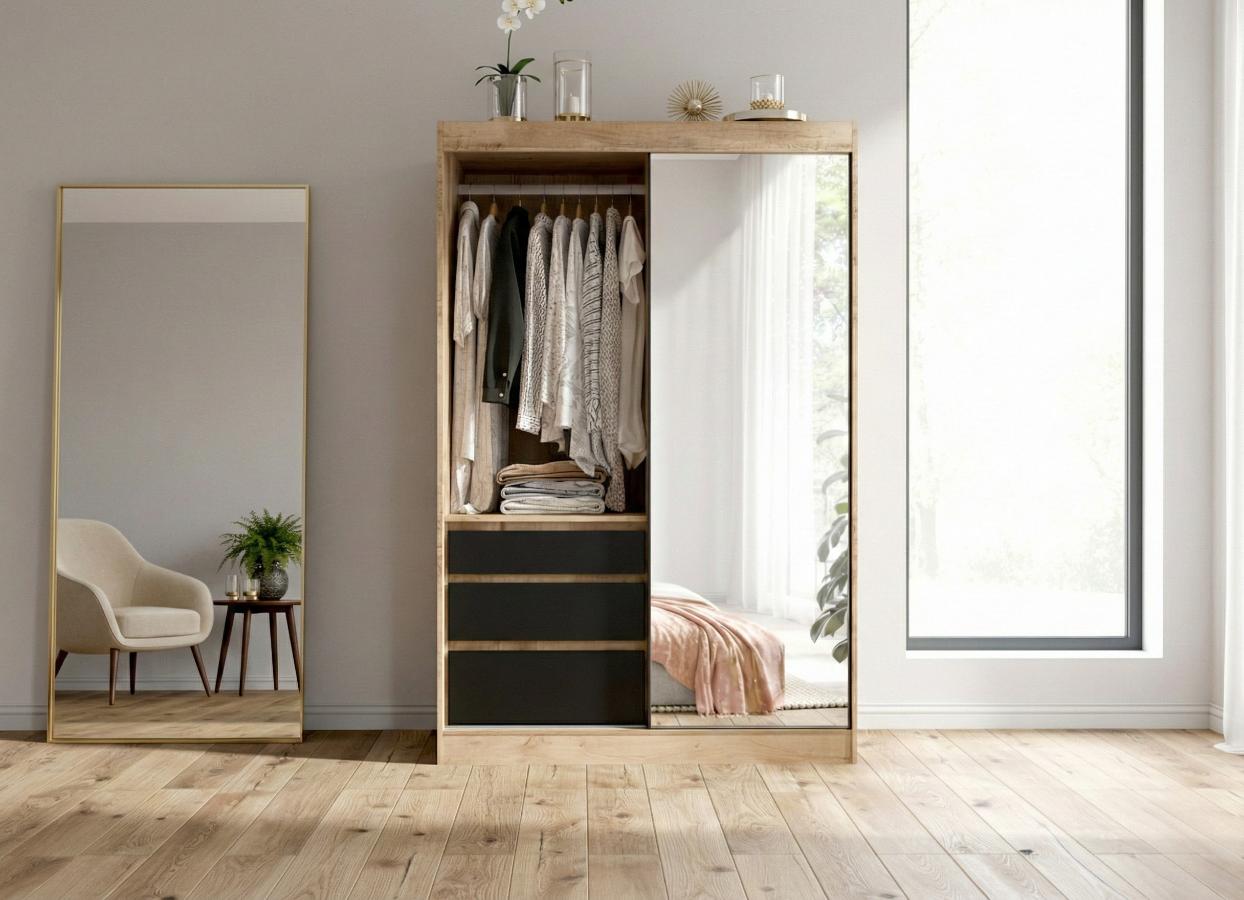 Wizualna strona szafy przyciąga wzrok swoją minimalistyczną formą oraz starannie dobraną kolorystyką, która idealnie wpisuje się w trendy skandynawskie oraz loftowe. Front mebla został podzielony w sposób przemyślany, gdzie duża tafla lustra nie tylko pełni funkcję praktyczną, ale również optycznie powiększa przestrzeń, nadając pomieszczeniu głębi i rozświetlając je naturalnym światłem.