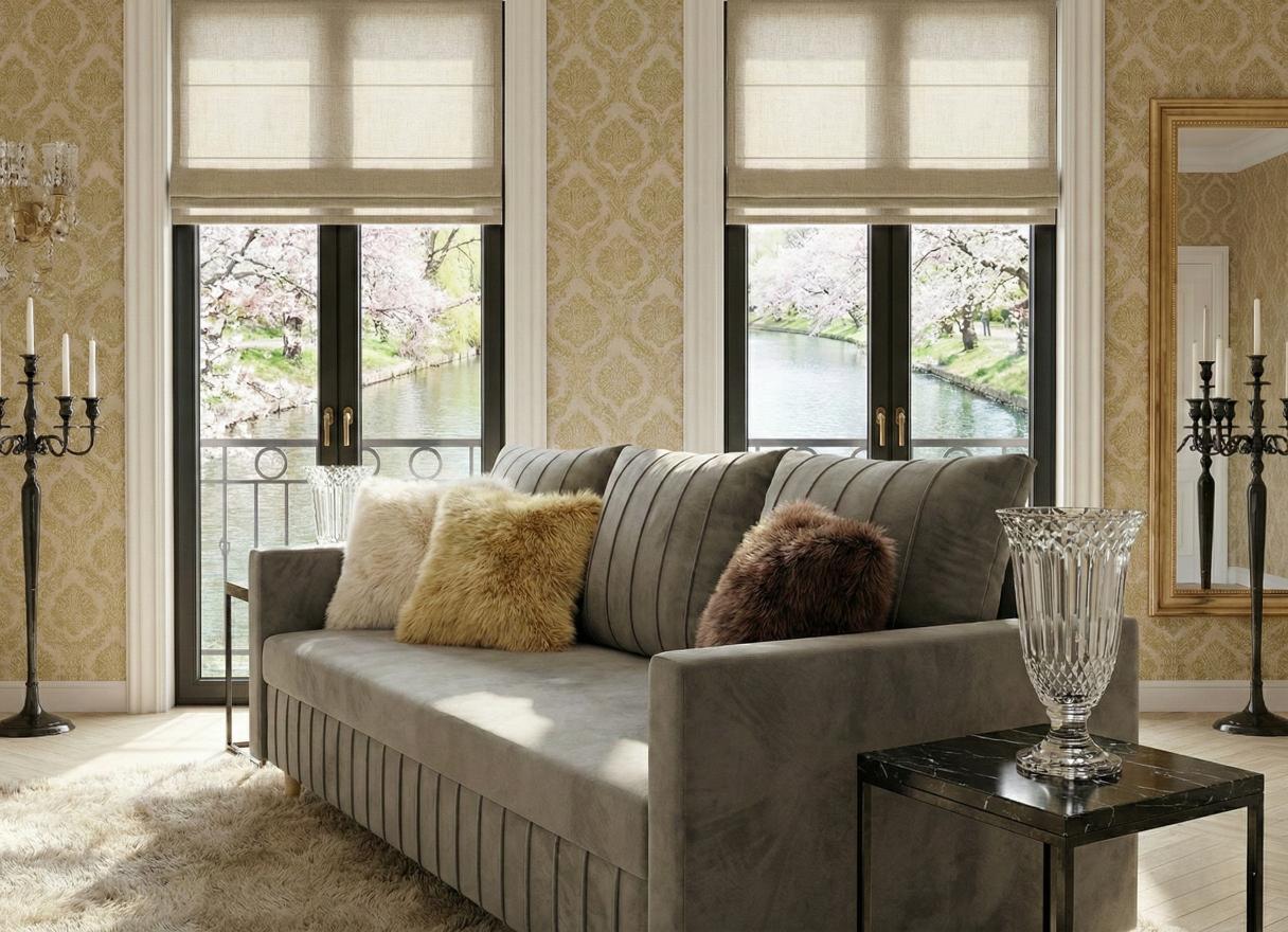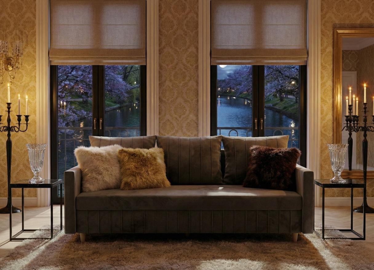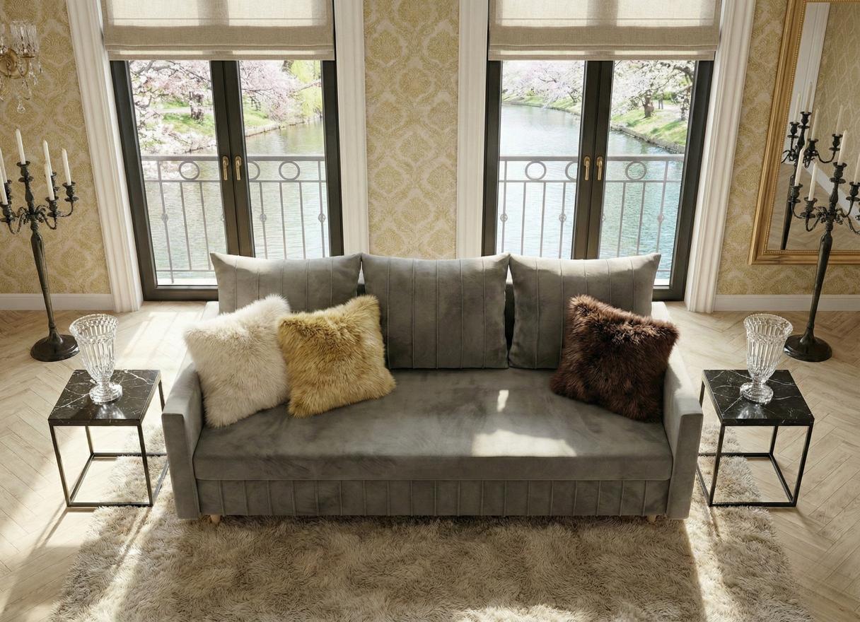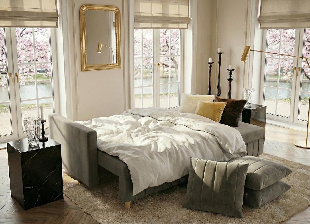 Wyobraź sobie wnętrze skąpane w blasku złota i soczystej zieleni, gdzie przez duże okna balkonowe wpada ciepłe światło, oświetlając ogród z kwitnącym drzewem akacjowym. W centrum tego salonu stoi ona - Sofa Rozkładana 3-Osobowa PRESTON. To nie jest zwykły mebel; to serce domowego ogniska, które łączy w sobie bezkompromisowy komfort, nowoczesny design i funkcjonalność, jakiej oczekujesz od mebli klasy premium.