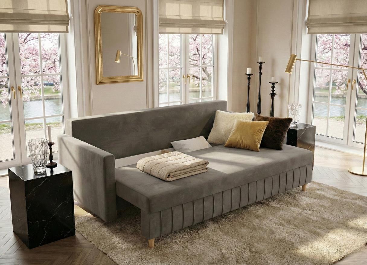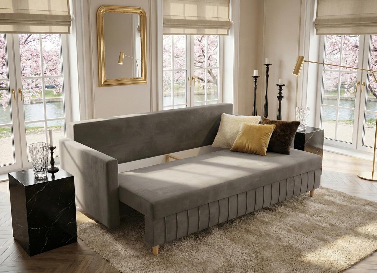 SZARA SOFA ROZKŁADANA 224 CM WATSON – WELUROWA ELEGANCJA I DETALE, KTÓRE PRZYCIĄGAJĄ WZROK